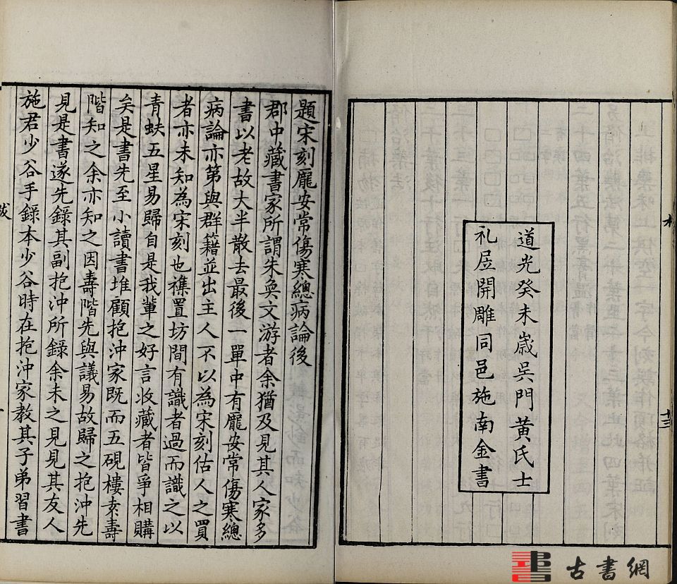 卷首有序,卷末有后序,札记后镌“道光癸未嵗吳門黃氏士礼居開雕同邑施南金書”;黄丕烈“題宋刻龐安常傷寒總病論後”