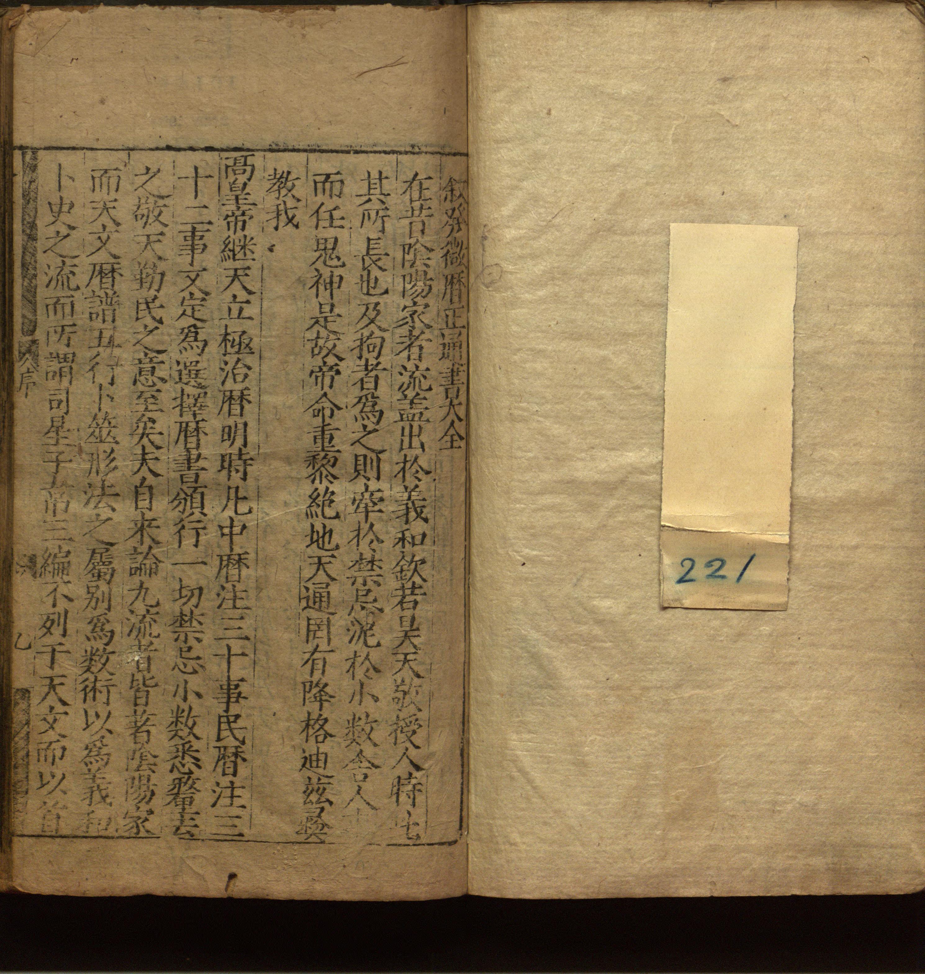 正文卷端题"新刊重考全补发微历正通书大全卷之一",下署"临江宋曾珍辉山通书,金谿何士泰景祥历法,鰲峰熊宗立道轩纂,乐平吴斋洪理天典历府,章贡云隐池纪本理重类,薌溪陵冈顾乃德敬甫历正"。正文前有嘉靖三十一年夏浚"叙发微历正通书大全",顾乃德"全补发微历正通书序","会杨授受五行体用之"图,卷一至三目录。以下每册前有目录,除第七册外每册前有图一幅,刻印较粗。末叶有莲花座木记六行,题曰:"通书一书,名色杂出。五行倒论,祕传悉/演。兹因受陵冈全补历正通书一部,命/工鋟梓,荣惠天下,以便选览。凡我四方/君子,务要认取书林后街积善堂茂和/续刊增补图局。明白标题,方為的实者。/万历壬辰年(二十年,1592)孟春月吉旦日,陈氏刊行"。据卷前顾乃德序末行题:"万历十九年岁次辛卯孟春吉日,书林陈春茂和刊行",是陈氏名春,字茂和。通书為民间历法阴阳五行万寳全书,此书实為顾乃德据旧本增补。