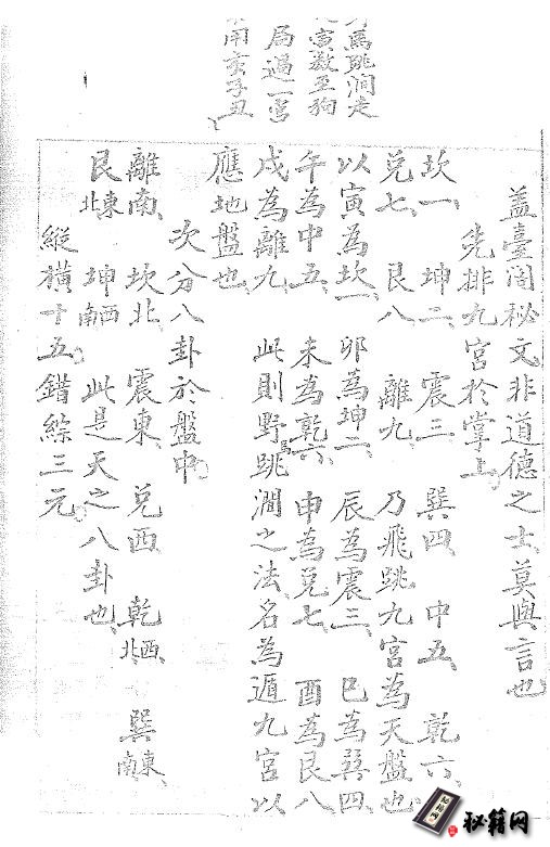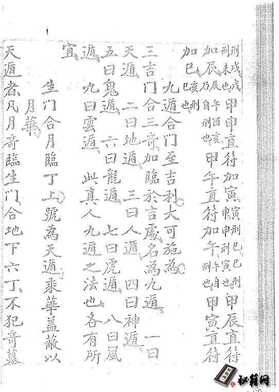 余素这奇门遁甲久不得见善本,考诸坊间不过造宅三白之法,而于军旅奥妙略而不详丁酉夏得奇门总注,基上深沈未易窥测庚子。秋借得孝廉田子,宗遁甲奇门秘本,明白晓畅且有阴阳家简便诸法,惟久不搦管手生笔突,因求子岱李先生抄录半载书就不可谓非幸也,虽然奇门一书原重阴阳符经,今不得见斯酋得丰而止者也,