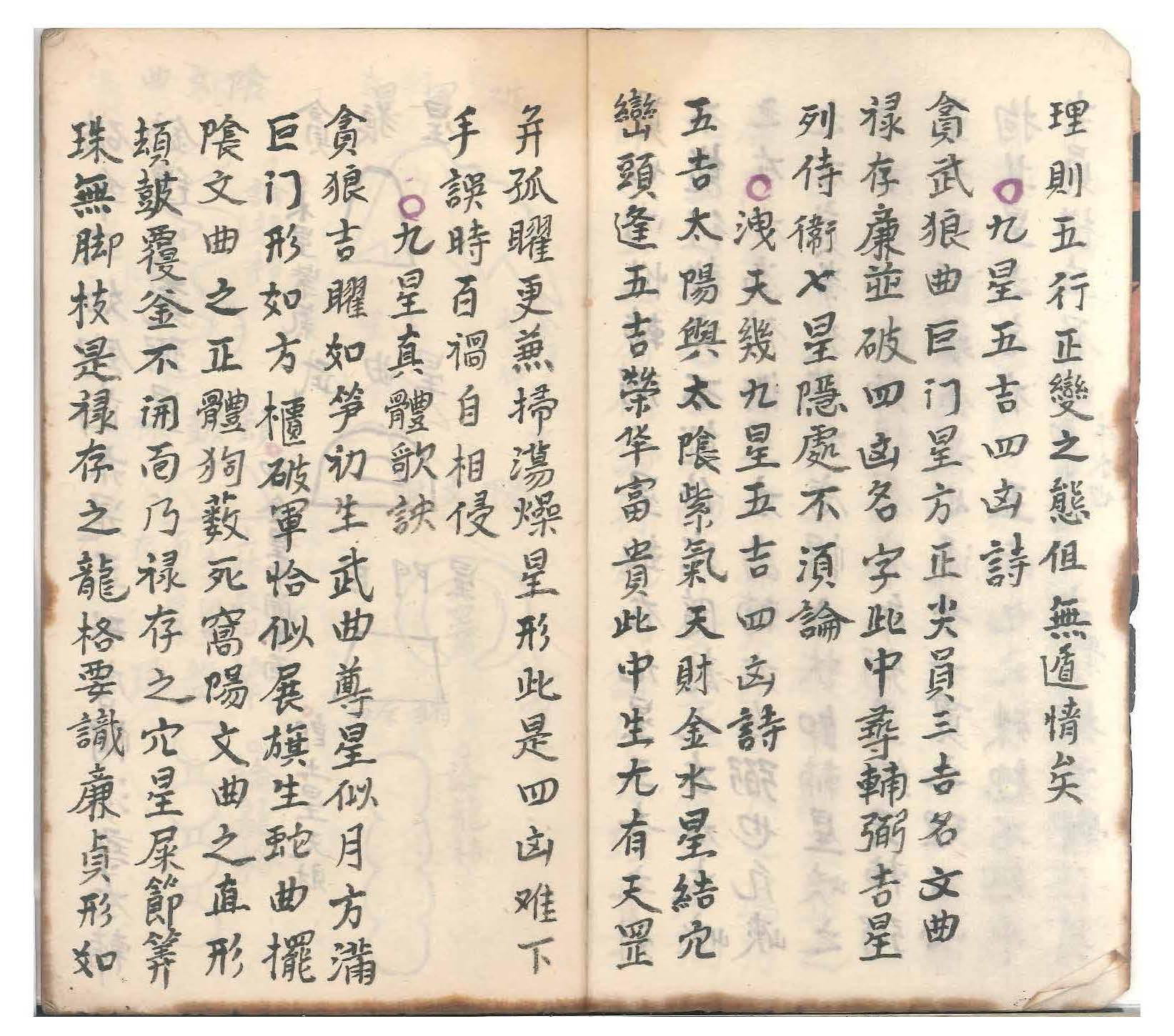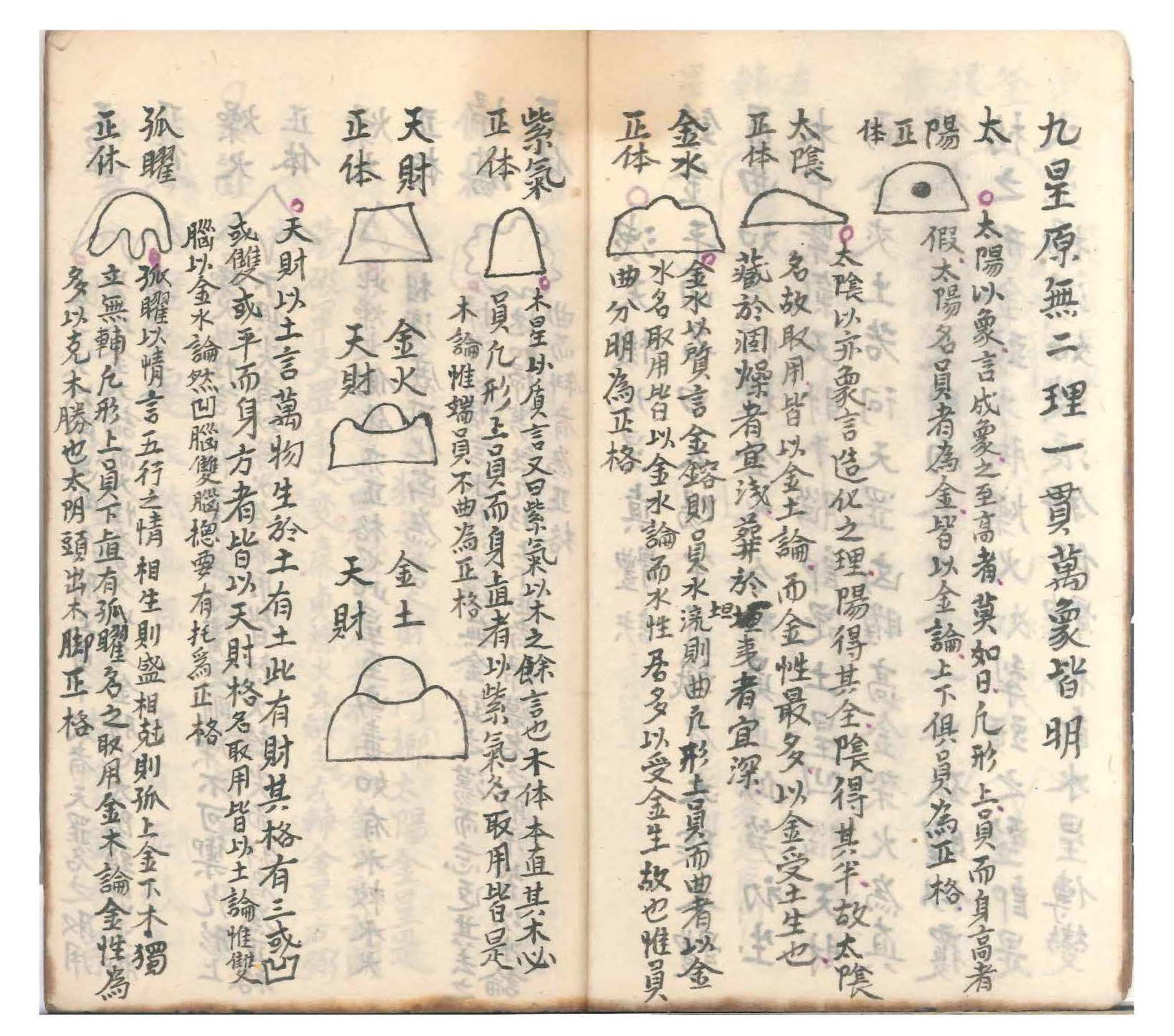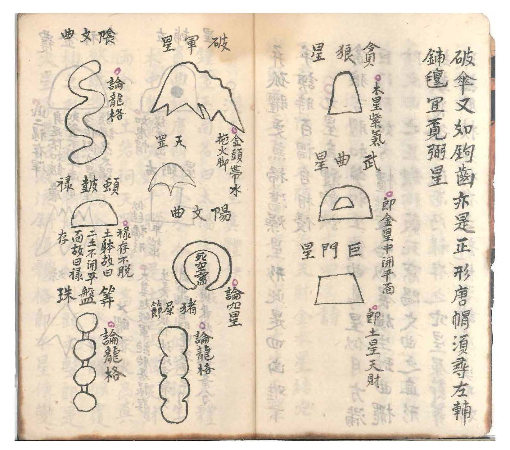 惟有九星创自杨公,本天星而立名号,故有贪巨禄文廉武破辅弼之星论。嗣后《泄天机》见五星不能穷其变,又各立名号,有太阳太阴金水紫气天财天罡孤曜燥火扫荡之星论。二公创论星名虽异,星理实同。何先辈偏议者?以贪巨等九星为审龙,以太阳等九星为辨穴,似乎分属甚非通论。试以形象究之,一五星与两九星莫非一理。如杨公曰贪狼即泄天机之紫气滞五星即木也;杨曰巨门即泄天机之天财在五星即土也;杨曰武曲即太阳即金也;曰文曲即扫荡即水也;曰禄存即金土之属;曰孤曜即金木之属;曰破军即天罡之属,乃金火之变也;曰廉贞即燥火之属,乃火星之变也;曰左辅即金星之属;曰右弼即水星之属。何论行龙何论作穴理皆一贯也。内惟辅弼二星虽在九星五吉之列,不能行龙亦不能作穴,随龙之左右或峡之左右为侍卫星,左为辅右为弼也。凡峡之左有圆峰夹照如唐帽状即辅星,峡之右平地如铺毡展席即弼星。经云辅弼二星七曜隐藏处是也。通乎一贯之理不必拘其星之名有一五两九之殊,总不越乎尖圆横直屈曲(即火金土木水也)之体。按其体得其理则五行正变之态俱无遁情矣。