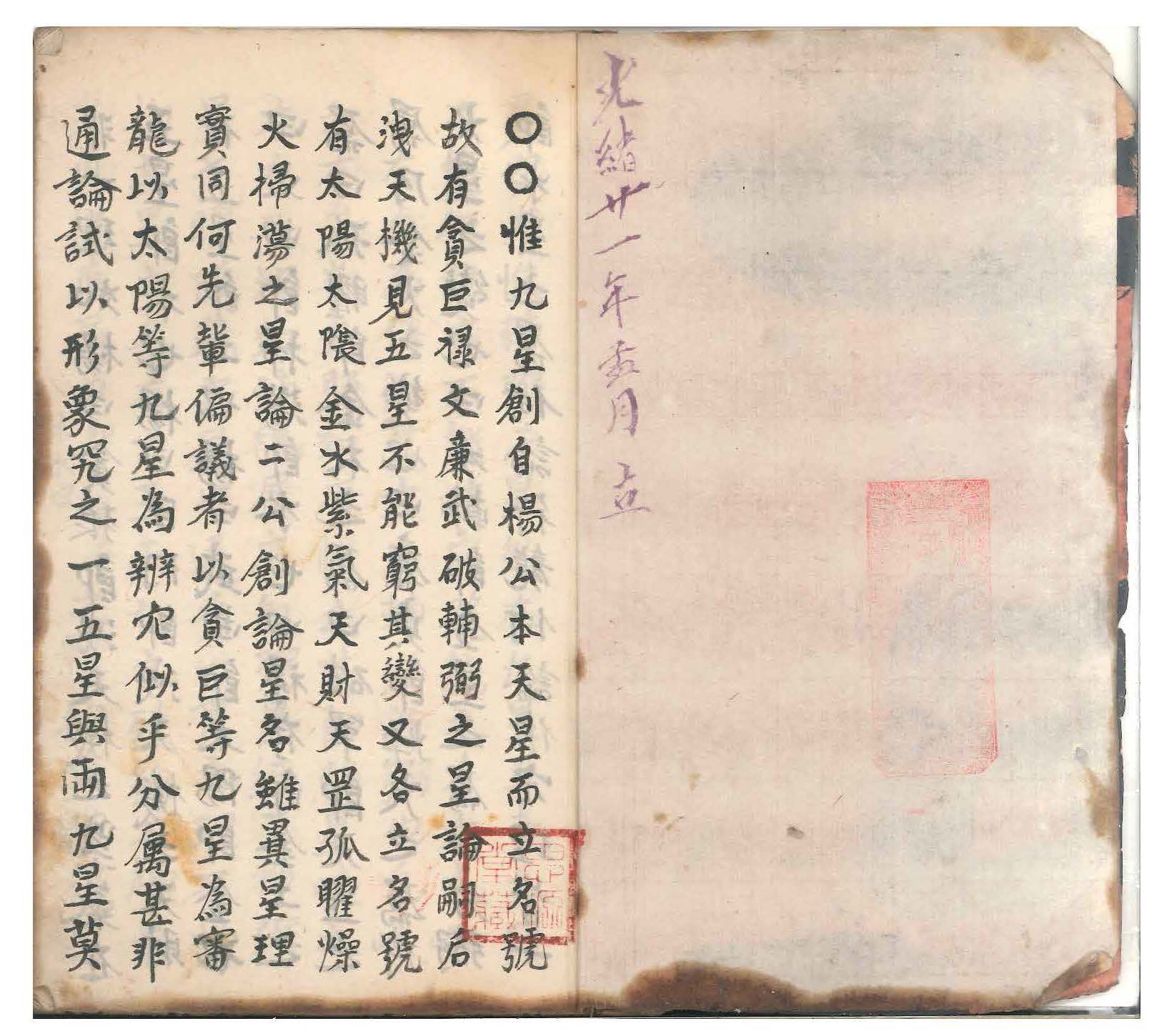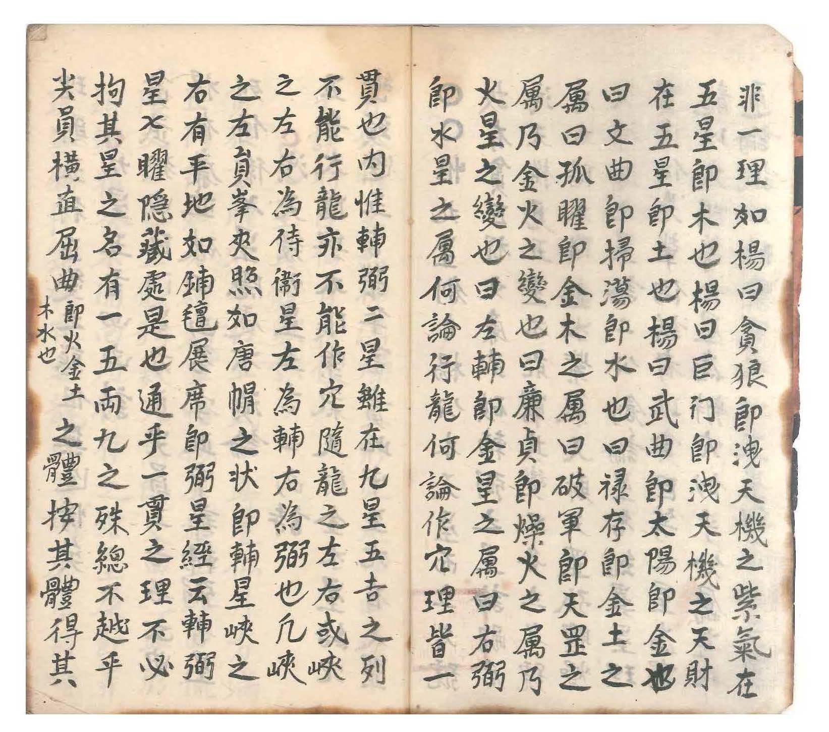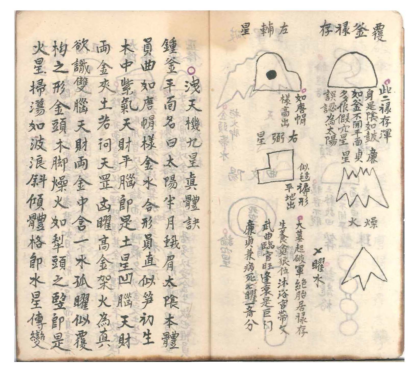 惟有九星创自杨公,本天星而立名号,故有贪巨禄文廉武破辅弼之星论。嗣后《泄天机》见五星不能穷其变,又各立名号,有太阳太阴金水紫气天财天罡孤曜燥火扫荡之星论。二公创论星名虽异,星理实同。何先辈偏议者?以贪巨等九星为审龙,以太阳等九星为辨穴,似乎分属甚非通论。试以形象究之,一五星与两九星莫非一理。如杨公曰贪狼即泄天机之紫气滞五星即木也;杨曰巨门即泄天机之天财在五星即土也;杨曰武曲即太阳即金也;曰文曲即扫荡即水也;曰禄存即金土之属;曰孤曜即金木之属;曰破军即天罡之属,乃金火之变也;曰廉贞即燥火之属,乃火星之变也;曰左辅即金星之属;曰右弼即水星之属。何论行龙何论作穴理皆一贯也。内惟辅弼二星虽在九星五吉之列,不能行龙亦不能作穴,随龙之左右或峡之左右为侍卫星,左为辅右为弼也。凡峡之左有圆峰夹照如唐帽状即辅星,峡之右平地如铺毡展席即弼星。经云辅弼二星七曜隐藏处是也。通乎一贯之理不必拘其星之名有一五两九之殊,总不越乎尖圆横直屈曲(即火金土木水也)之体。按其体得其理则五行正变之态俱无遁情矣。