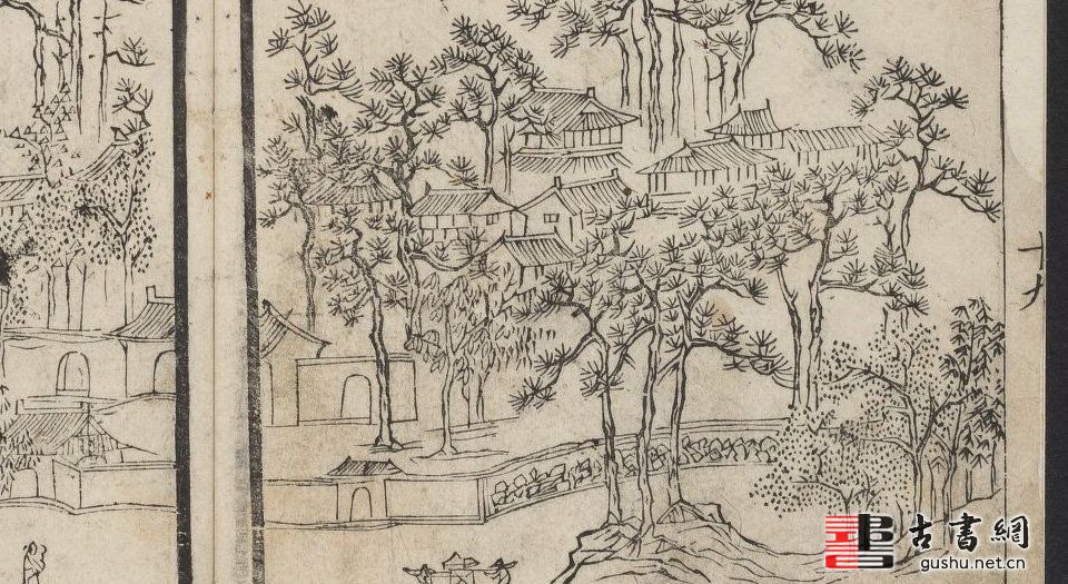 此本包含:越游览图咏.西江游览图咏,两本吴楚奇所绘吴越和西江地区的山水名胜、古迹、风物名胜。每图配以诗文,诗文为陈维所录,一图一文。河埠、山岗、树石、亭台、舟楫、人物等相互穿插,精心布置,披览之下,如身在画中。