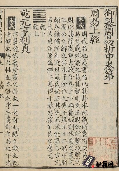 此本是清康熙皇帝参与编写关于《周易》的书籍,所以称作“御 纂”。清康熙年间设刻书处于武英殿,故有殿板之称。《折中》一书,由康熙所制序文介绍,乃“越二寒暑而告成”于康熙五十四年春。可知此书之作始于康熙五十二年。