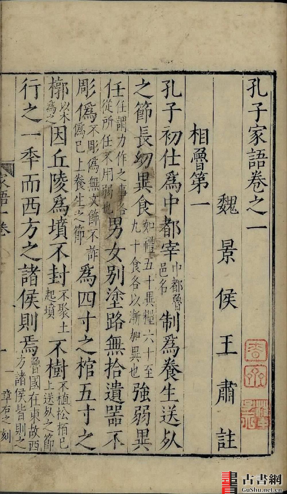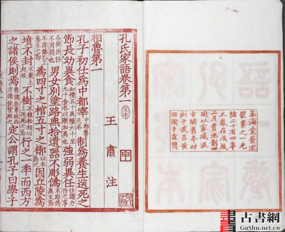 《孔子家语》是一部记录孔子及孔门弟子思想言行的著作。其内容或是自汉朝以前到汉朝早期不断编纂而成,后来王肃注对其整理注解。今传本共十卷(原二十七卷),四十四篇。此内含明隆庆六年徐祚锡长洲刊本,清光绪二十四年贵池刘氏玉海堂景宋蜀刊朱印及墨印本。