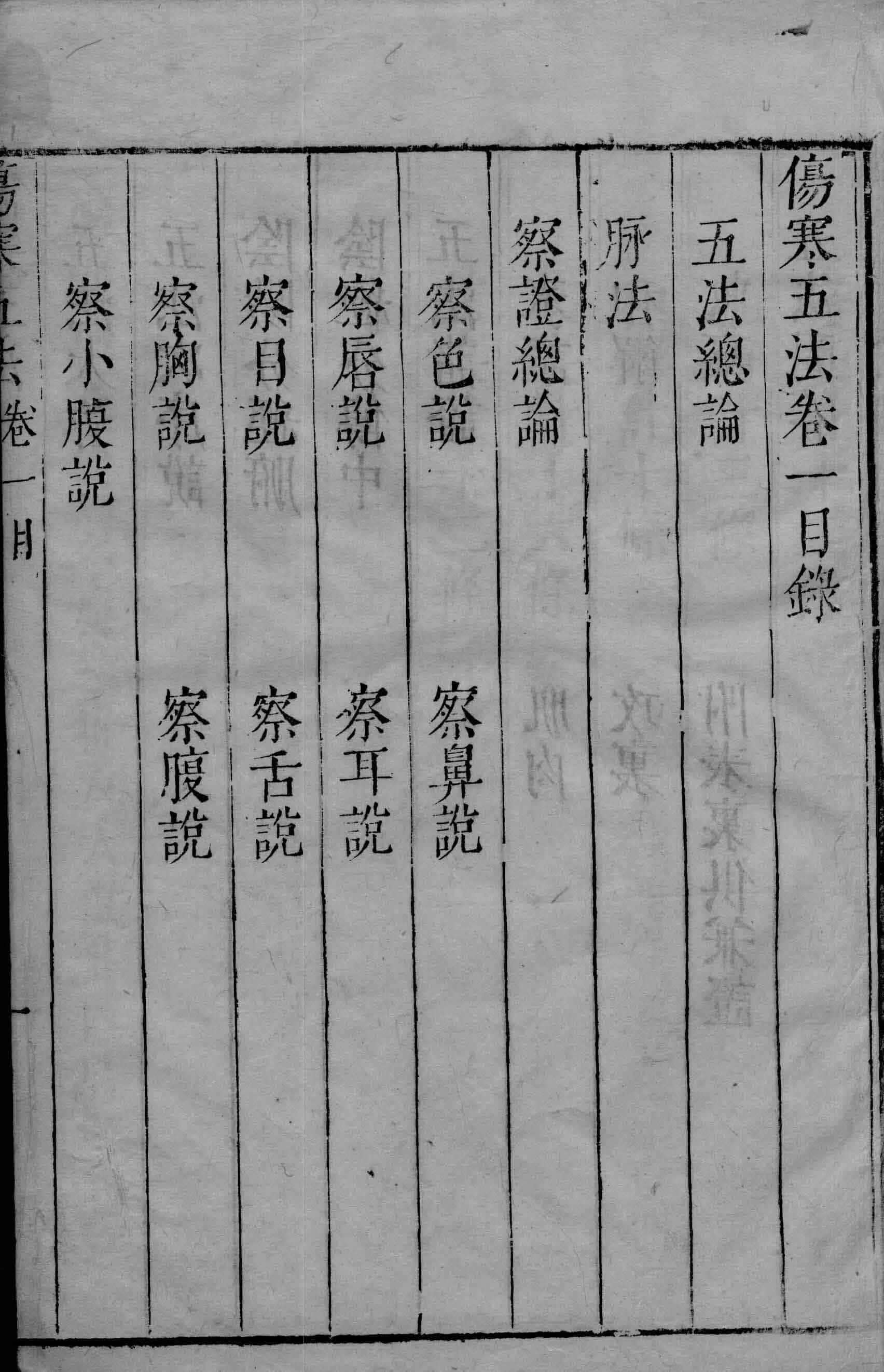 伤寒五法 目录:五法总论,脉法,察证总论,察鼻说,察色说,察耳说,察唇说,察舌说,察目说,察腹说,察胸说,察小腹说,五法大旨等。