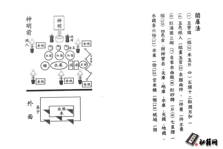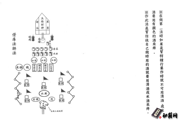 需要的物品:七得灯两组,五果一份,天库地库水库各十万,天钱地钱水钱,钱一百零八个,银行水五瓶,十二生肖水一瓶,自家水一瓶,矿泉水一瓶,红剑兰十朵,石头二十粒,五色旗一组,米五杯,三角令牌一个,福圆米糕一个,红汤圆三碗,酒五杯,茶五杯,这些是做法需要的物品,