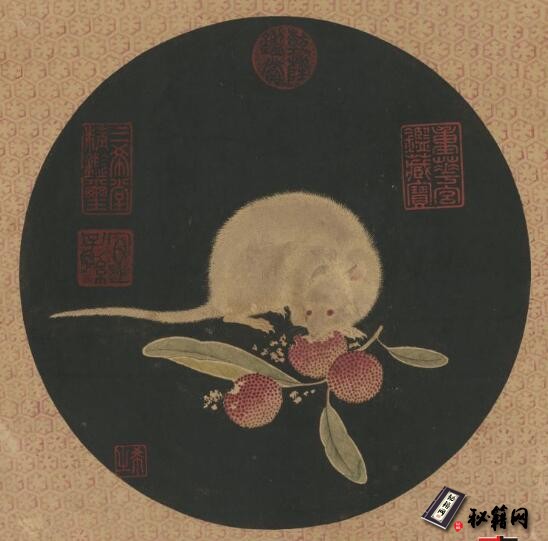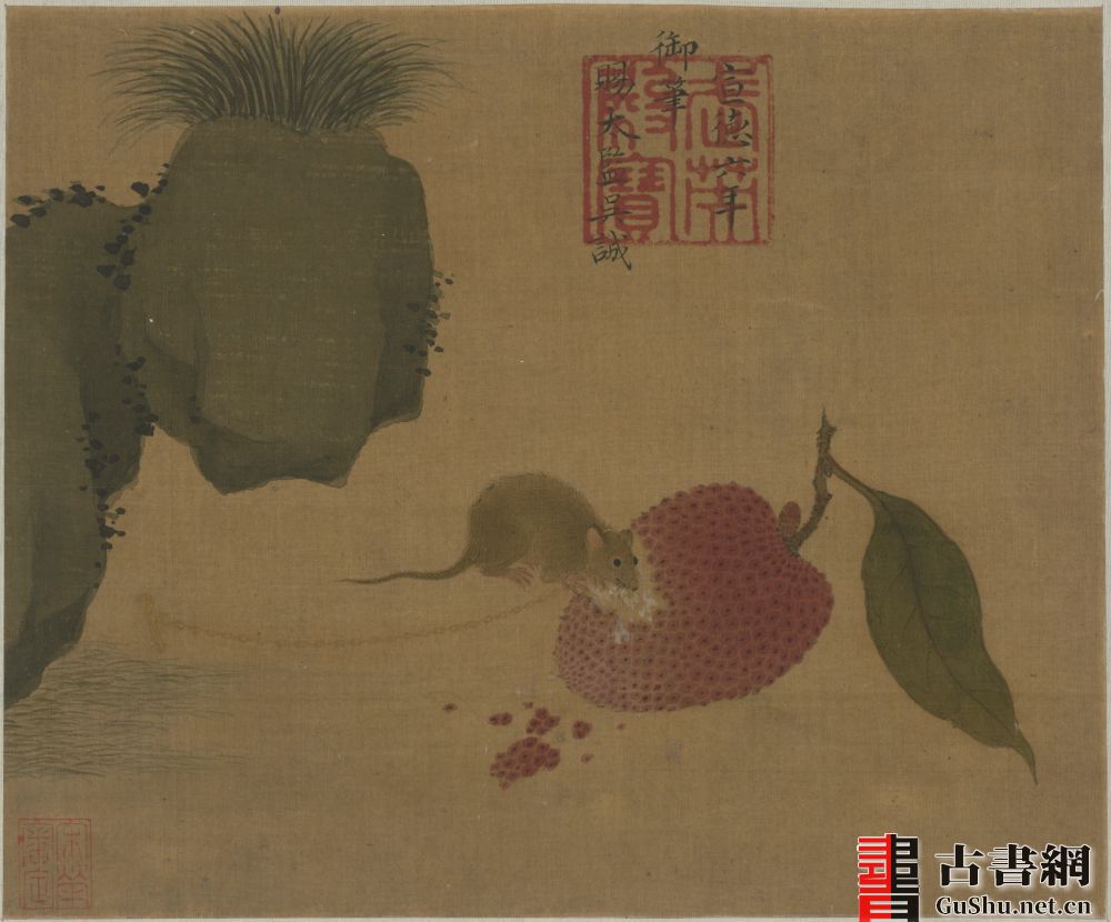 此图为一帧团扇,其构思与《菖蒲鼠荔图》大致接近。所写为一只白鼠啃食三只荔枝,荔壳散落于地,另有三片绿色的荔叶陪衬。由于此画写在瓷青纸万年蓝上,故老鼠的 “白” 与荔枝的 “红” 在蓝色底纸的衬托下,显得尤为抢眼,似有描写老鼠在夜幕下偷食的背景。此画亦为工笔重彩,颇有宋代院体花鸟画风格。画上并无作者题识,但对幅有明宪宗朱见深题跋:“御製。累累果實委塵垂,夜靜無端出沒時。意料狸奴踪跡少,肆行竊齧上新枝。成化甲辰仲秋吉日” 此跋作于成化二十年。