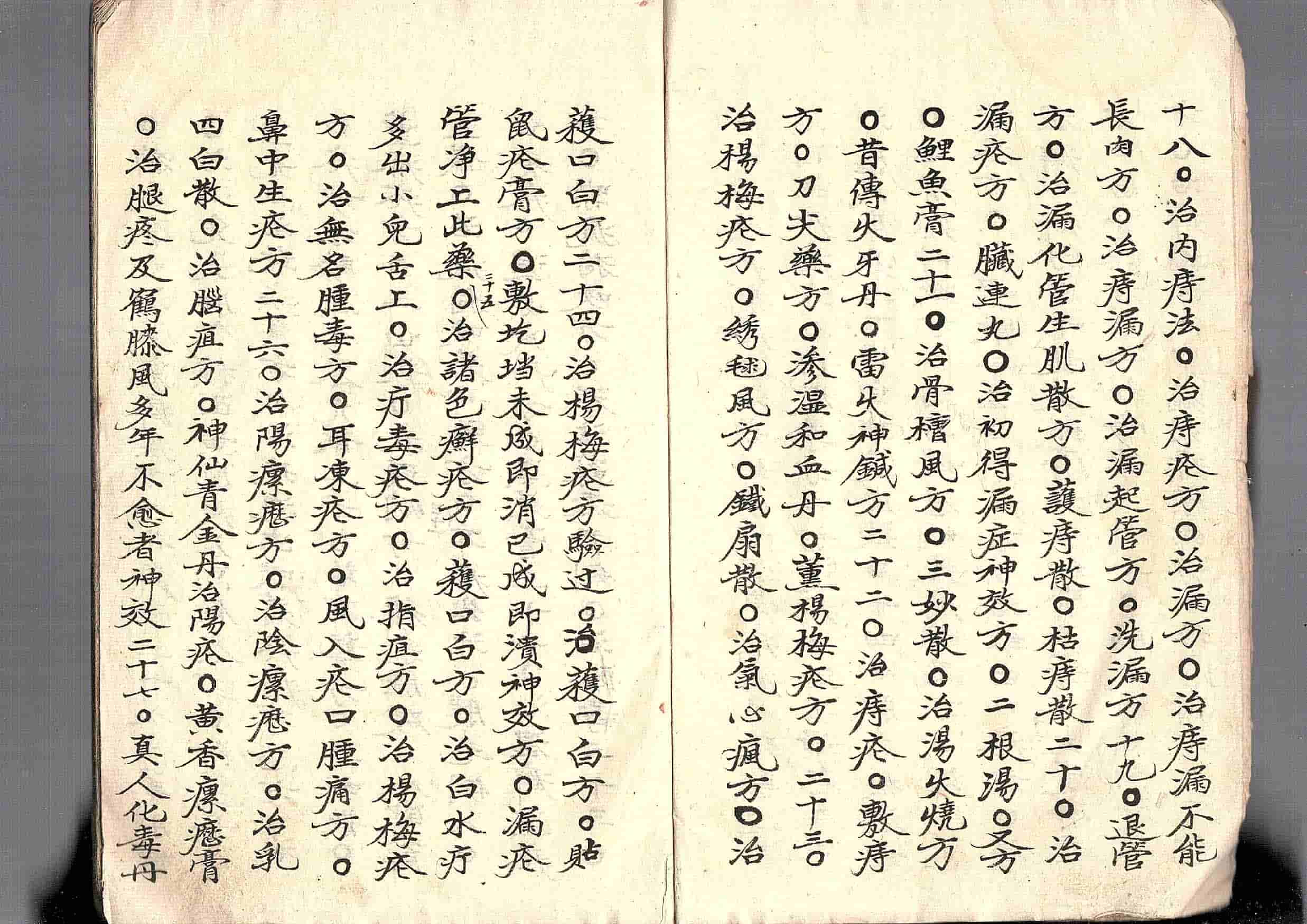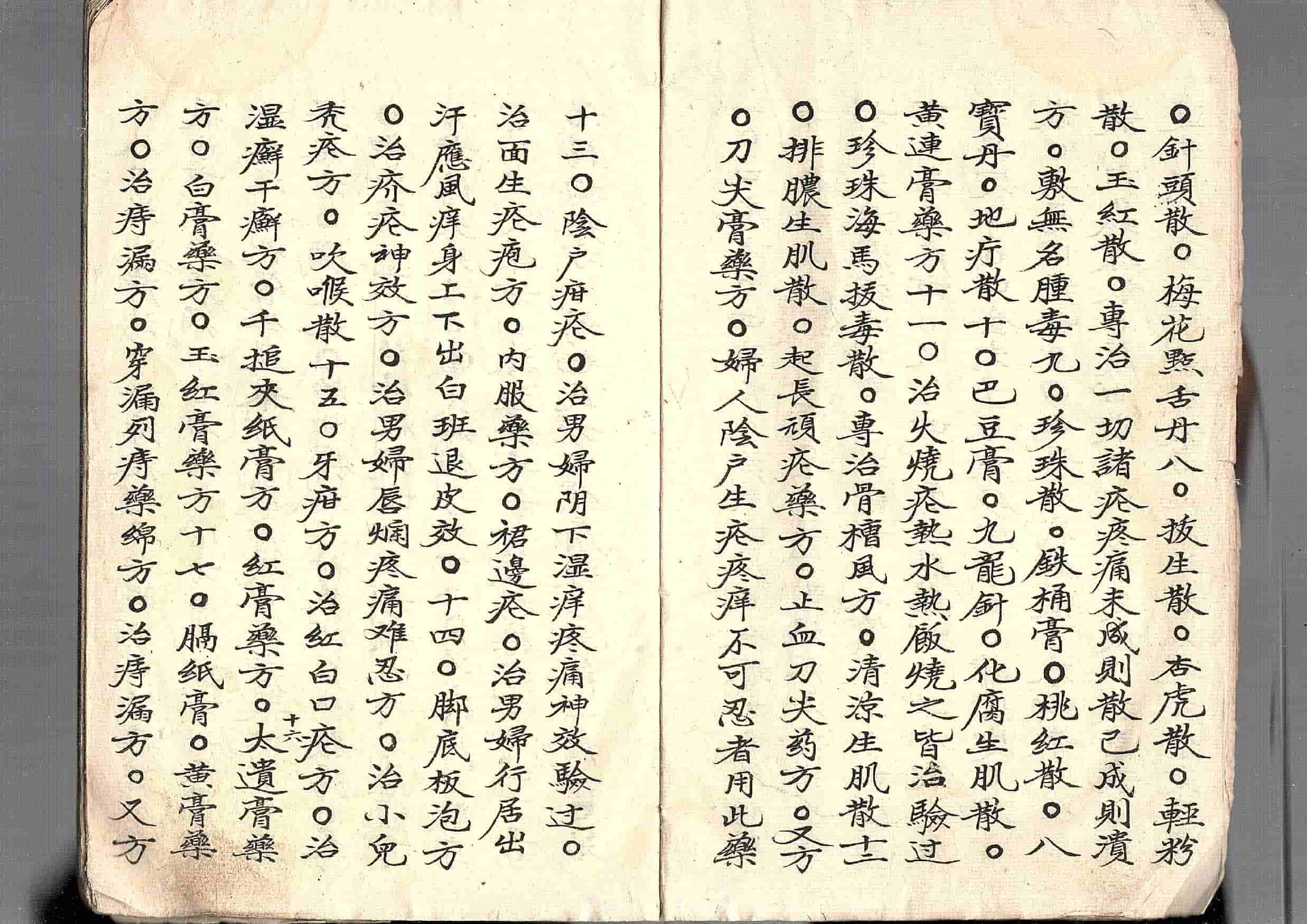 内容包括:牙痛方、化毒丹、八宝散、红膏药方、治牙疳方、牙疳服药又方、三品定子、四金定子、透骨散、四白散、代针散、生肌散、珍珠散、人马平安散、黄连生肌散、八宝生肌散、针头散、玉红散、铁桶膏、桃红散、地疔散、巴豆膏、九龙针、黄连膏药、清凉生肌散、刀尖膏药方、面生疮疱、枯痔散、红燕丹、湿疥疮方、八味丸、十全大补汤、治妇人三十二杂症等。