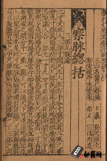 卷首载察脉总括、脉诀,次述“七表、八里、九道”及杂证诸脉机理及脉象,附《五脏脉候虚实冷热引经用药证治之图》,后论五脏病虚实证、论祟脉、绝脉。本书以《脉诀》为本,参合宋以前诸家脉学之言,订误撷精,简明而多新见,为时人所重。未另附《药象门》一卷为新增。