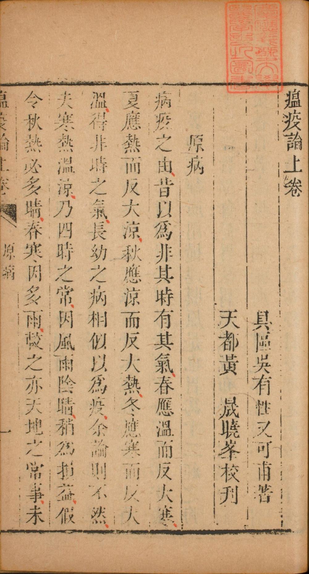 卷首题:具區吳有性又可甫著、天都黃晟曉峰校刊