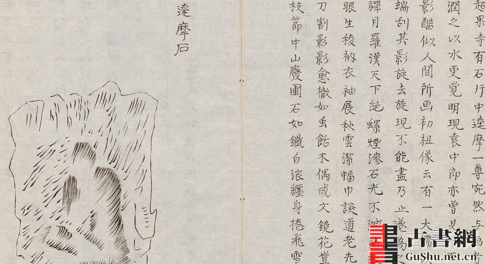 中国自古就有赏石的传统,在《尚书·禹贡》中即有关于青州贡品“铅松怪石”的记载。《素园石谱》明代林有麟编辑。全书共有四卷,共采录宣和以后典籍中所载名石百数种,始于蜀中永宁石,终于松江普照寺达摩石。所录各石俱一一绘图,缀以前人题咏。此本为清代(约18世纪)的钞本。