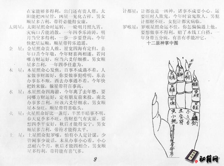 神机灵术一掌经总断神机灵术灵中灵、灵易之中藏玄机;玄机易变全是数、数中奥妙变无穷;有人能识易中术、天地全来一掌中;年月日时论得准、生旺死绝断人生;阴阳五行是数理、生克制化在其中;分为金木水火土、上天下地人居中;五行生克循环里、阴阳变化甚无穷;旺相修囚要细论、如果入墓怕三刑;三刑临命有灾病、不是住院便入狱、轻者也把口舌生;老病怕冲新忌合、一冲一合病不轻;日主受克也有病、病体部位要细分;子耳丑胞肚寅手、卯指辰肩脑、巳面咽齿午眼、未脊梁申经络、酉精血戌命门、与腿足亥是头、此是十二支配人体。