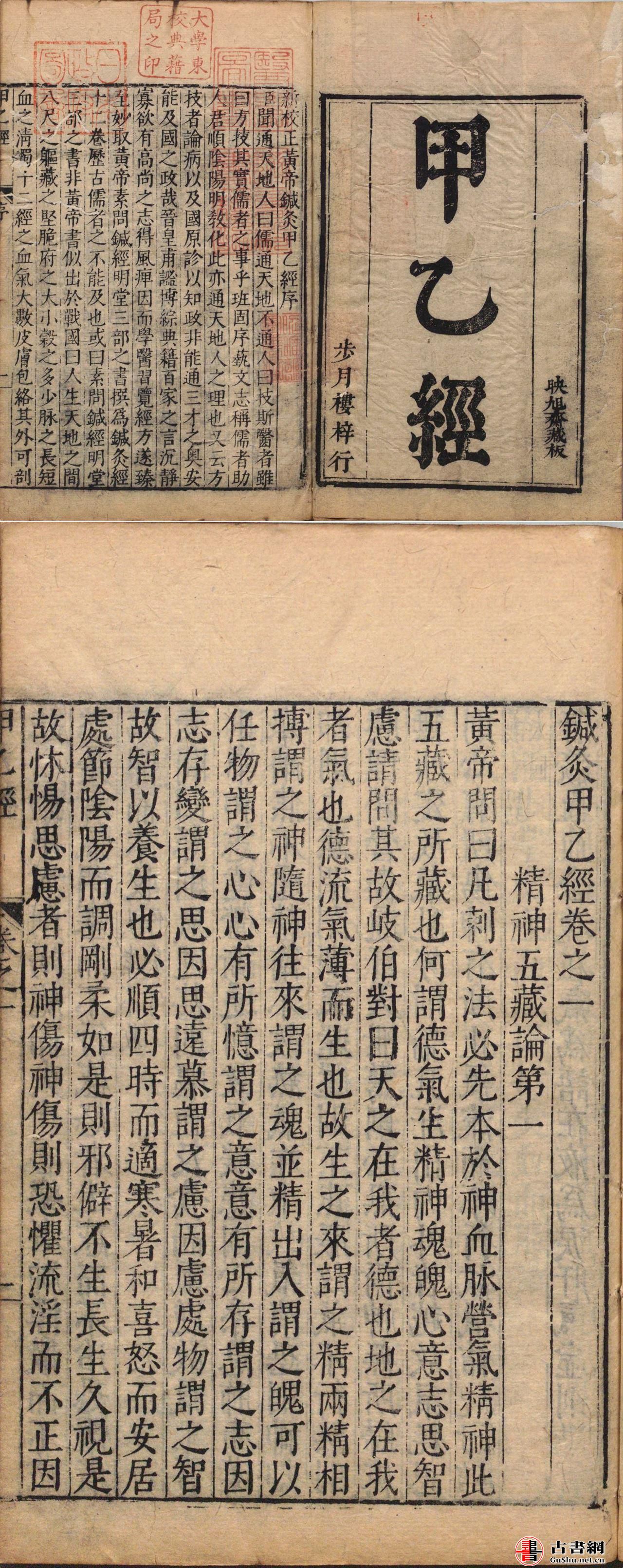 该书在流传过程中经历两次较大的整理。第一次是北宋校正医书局林亿等校注本,刊行于宋熙宁二年(1069),此后南宋、金、元均未见重刊。第二次是明万历年间吴勉学刊《医学六经》收入 此书,《医学六经》后被收入吴氏刊刻的医学丛书《古今医统正脉全书》,因后者流传较广, 前者反而鲜为人知。此外,清代藏书家陆心源《皕宋楼藏书记》载有明代蓝格抄本《黄帝三部针灸甲乙经》一部,陆氏藏书后为日人所购,今藏日本静嘉堂文库。《针灸甲乙经》宋版 今或亡佚,据《中国中医古籍总目》,现存版本有明万历二十九年(1601)吴勉学刻《古今 医统正脉全书》本、清光绪十年(1884)陆润庠家抄本等。