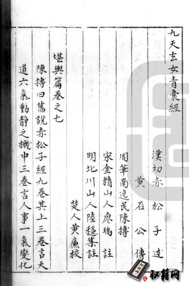 《九天玄女青囊经》,署汉赤松子述,黄石公传,周华南逸民陈抟、宋金精山人廖瑀注,明北川山人陆稳集注,楚人黄廉校。