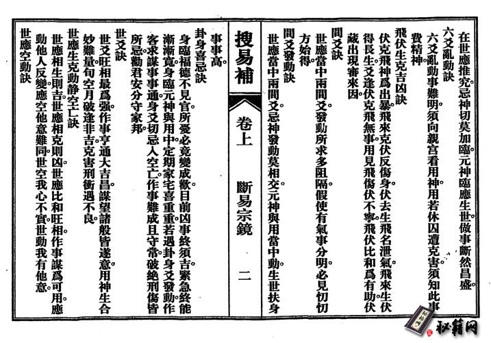 卜 筮 之 道 , 全 在 變 通。 或 主 于 大 象 之 凶吉,或重于世 用之旺衰,或取决六親而論,或尊崇六神以推;識陰陽 動 静 而 知 變 化 , 明 五 行 生 克 以 論 否 泰。 歷 來 聖 賢 , 探 幽 索 隱,闡奥發揮,各有特點,每有精論,譬若占天時晴雨為 例 : 《 斷 易 參 補 》 以 六 爻 斷; 《 海 底 眼 》 以 五 行 斷; 東 方 朔以天午斷;《磨鏡藥》以地支斷;葉道元以六親斷; 《 易 心 訣 》 以 六 神 斷; 《 摘 星 集 》 以 世 應 斷; 劉 伯 温以陰 陽斷 ,張星元以八卦斷。可謂仁者見之謂之仁, 智者見 之 謂 之 智。 雖 絶 論 紛 紜 , 然 理 總 歸 一 。能透悟生克制化之 玄妙,善于通變推類,雖易道幽奥,而無不靈應如響。例 如:趙輔和曾見筮者為某占父病,卜得泰卦,筮者雲: 『甚吉,疾當愈』。是人喜去。后趙輔和謂筮者曰:『泰卦 乾下坤上,然則父入土矣!豈得言吉』。后果以凶聞。此非 通 變 之 驗 乎 ? 又 如占病或占訟,卜得解卦,可許吉兆,倘問婚事,則主乖忤。又如《靈應真經 雜見應》 外應斷 雲: 『… … 破竹剖笋,勢必順暢… … 』倘占征戰或出行’ 恰逢此象者固然吉推。若占婚姻或占合伙遇之者,必主 不利。凡此類例,數不勝舉。 余撮引百家之訣旨,搜羅萬類之占例,其的是供 后學者融會參悟,引伸聯想,而善蓮變,以致不拘泥于 某法某論而難以登堂入室也。
