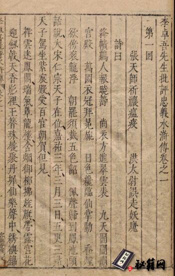 此《李卓吾先生批评忠义水浒传》由明代李贽评。全书共一百卷(百回本),引首一卷,始于:张天师祈禳瘟疫,洪太尉误走妖魔。终于:宋公明神聚蓼儿洼,徽宗帝梦游梁山泊。此为日本内阁文库藏明末容与堂刊本,无插图,有眉批、旁批和回末总评。