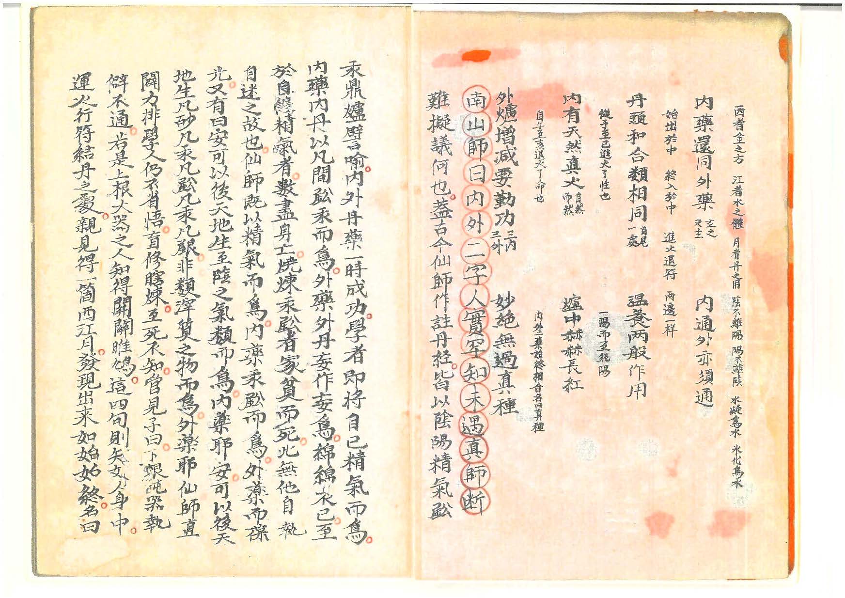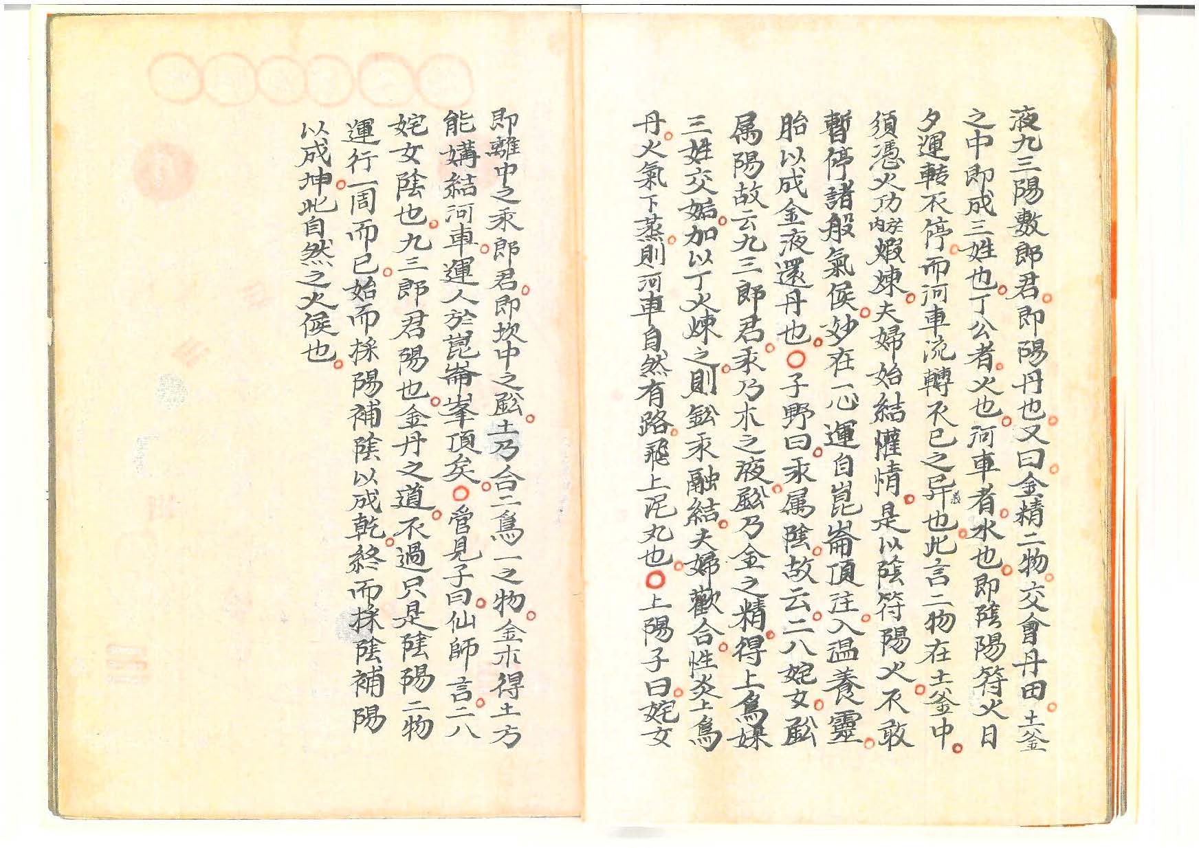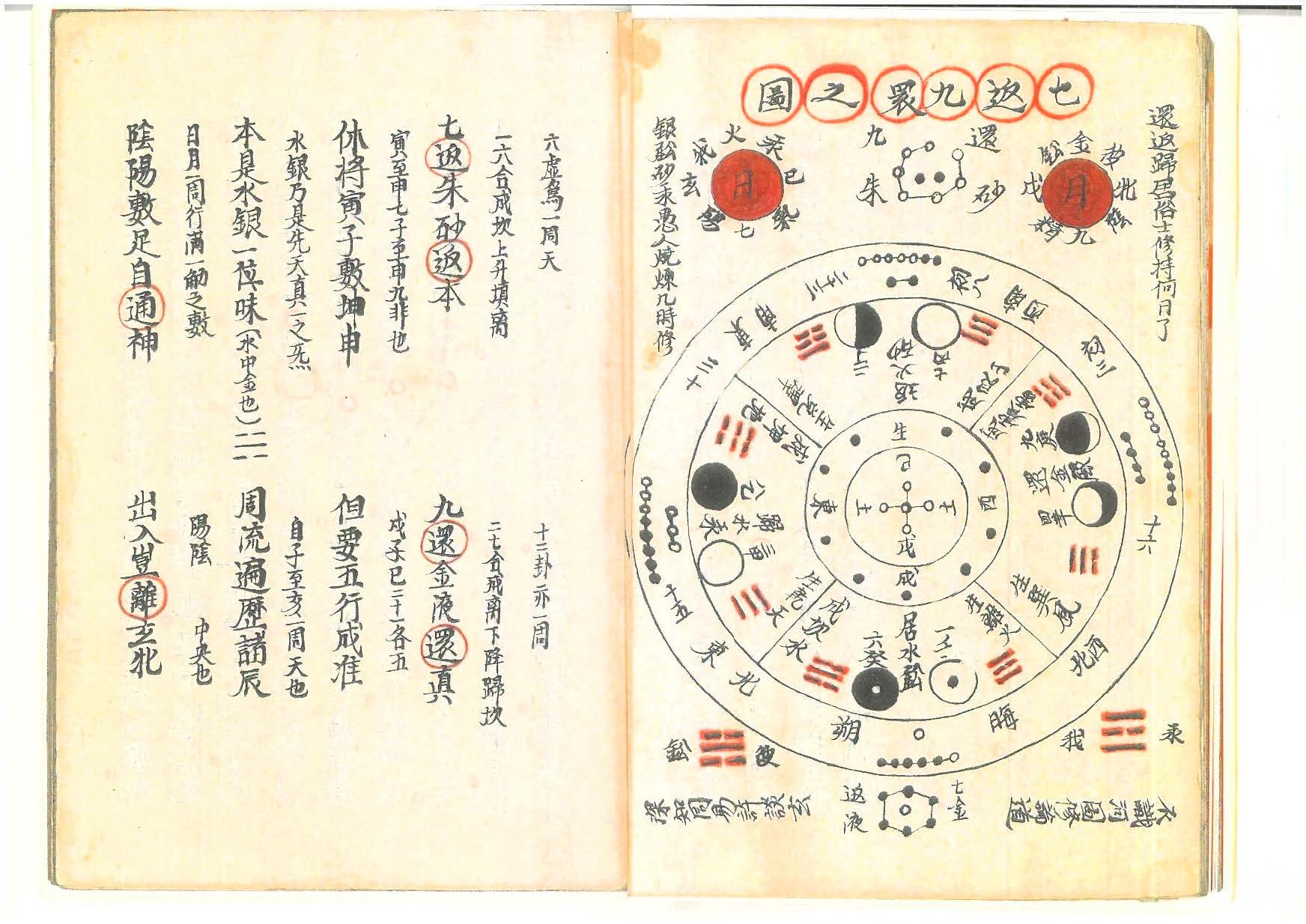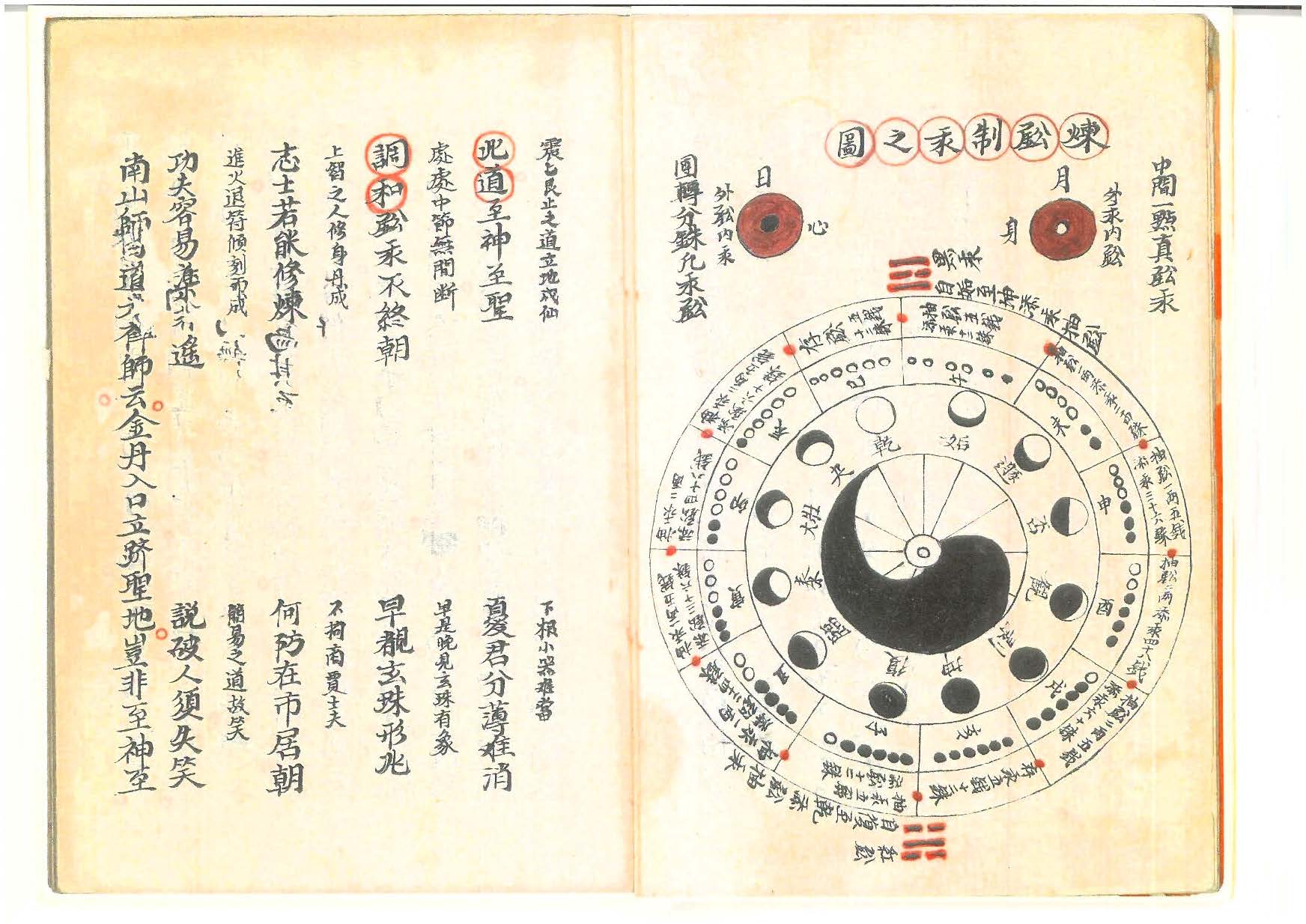 难拟议何也,盖古今仙师作註丹经,皆以阴阳精气欲汞鼎炉譬喻,内外丹药一时成功,学者即将自已精气而为,内药内丹以凡间铅汞而为,外药外丹妄作妄為,绵绵不已,至於自修精气者,数尽身亡,烧炼汞铅者家贫而死,此无他自执自迷之故也,仙师既以精气而为,内药汞铅而为,外药而葆光,又有曰安可以后天地生至阴之气类而为,内药耶安,可以后天地生凡砂凡汞凡铅凡汞凡银,非类滓质之物而为,外药耶仙师直闢力排学人仍不省悟,盲修瞎炼,至死不知,官见子曰,下银沌器执僻不通,若是上根大器之人知得关关雎鸠,这四句则知*人身中,运火行符结丹之处,亲见得一箇西江月,发现出来如始如终,名曰内药,即看此月从子行至巳位,谓之无中生有,是内阴而外阳,此进火之内外也,若以精气言之,是内精而外气,此精气之内外也,若以铅汞言之,是内汞而外铅,此铅汞之内外也,此之谓内有天然真火,内药以了性也,再看此月自午行至亥位,谓之有有化为无,是外阴而内阳,此退火之外内也,若以气精言之是外精而内气,此气精之外内也,若以汞铅言之,外汞而内铅此汞铅之外内也,此之谓外炉増减要勤功,外药以了命也,参同契曰,春夏处内体从子到辰巳,秋冬当外用,自午乾戍亥,此乃温养两般作用之内外也,纯阳翁云,内丹成外丹,就内外相接和诸,偶结结成一块紫金丸,变化飞腾天地人,此乃丹头和合类相同之内外也,内外相同,故曰真种子,予观圣人所教内外者,皆指目中所见之内外也,而非幽冥不见之内外也,且如天上晦日,太阴之上人皆见之,此乃内阴而外阳,喻之内精而外气,内汞而外铅,内叶而外丹也,知此理者,玩吾图中,以及旁註,则内外二字皆可得之於心目之间矣。