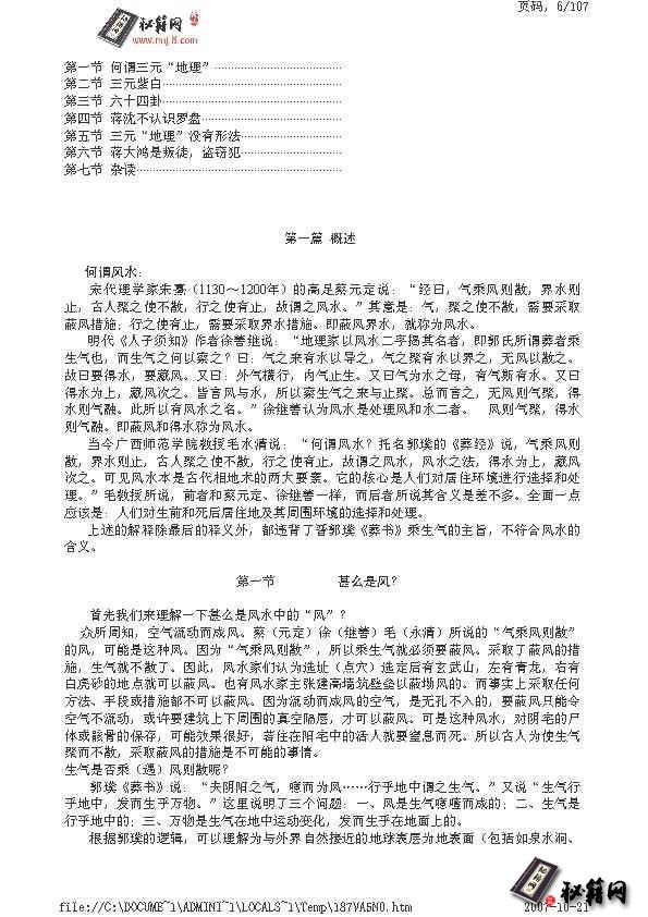 这并不是偶然现象,“客观社会的存在,决定人们的社会意识。”当今客观社会的风水 术,绝大部分都不是赣州杨救贫的风水术,而是江湖风水术。什么神龟点化?什么九天玄 女?什么仙人秘授?翻卦的,乘银河系北斗七星气的,特别是蒋大鸿的三元大玄空,连中 国罗盘都不认识,讲紫白天星,不用人盘。讲64卦,不用天盘,都用乘地球生气的地盘。 实实在在是骗人的迷信“风水”。是客观存在反映人们“视风水为封建迷信的社会风水意 识。”这也就不奇怪了。由于历史和其他的原因,人们对风水的认识也过于简单化了,甚 至丧失了最普通的常识。这样说的最简单的理由是: