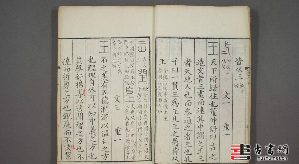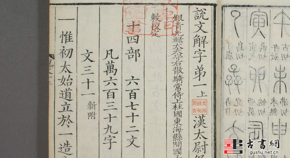 《说文解字》简称《说文》,是一部中国东汉许慎编著的文字工具书。原书现已失落,但其中大量内容被汉朝以后的其他书籍引用,并有北宋徐铉于雍熙三年(986年)校订完成的版本(称为“大徐本”)流传至今。此本为明末汲古阁藏板,北宋本校刊本。