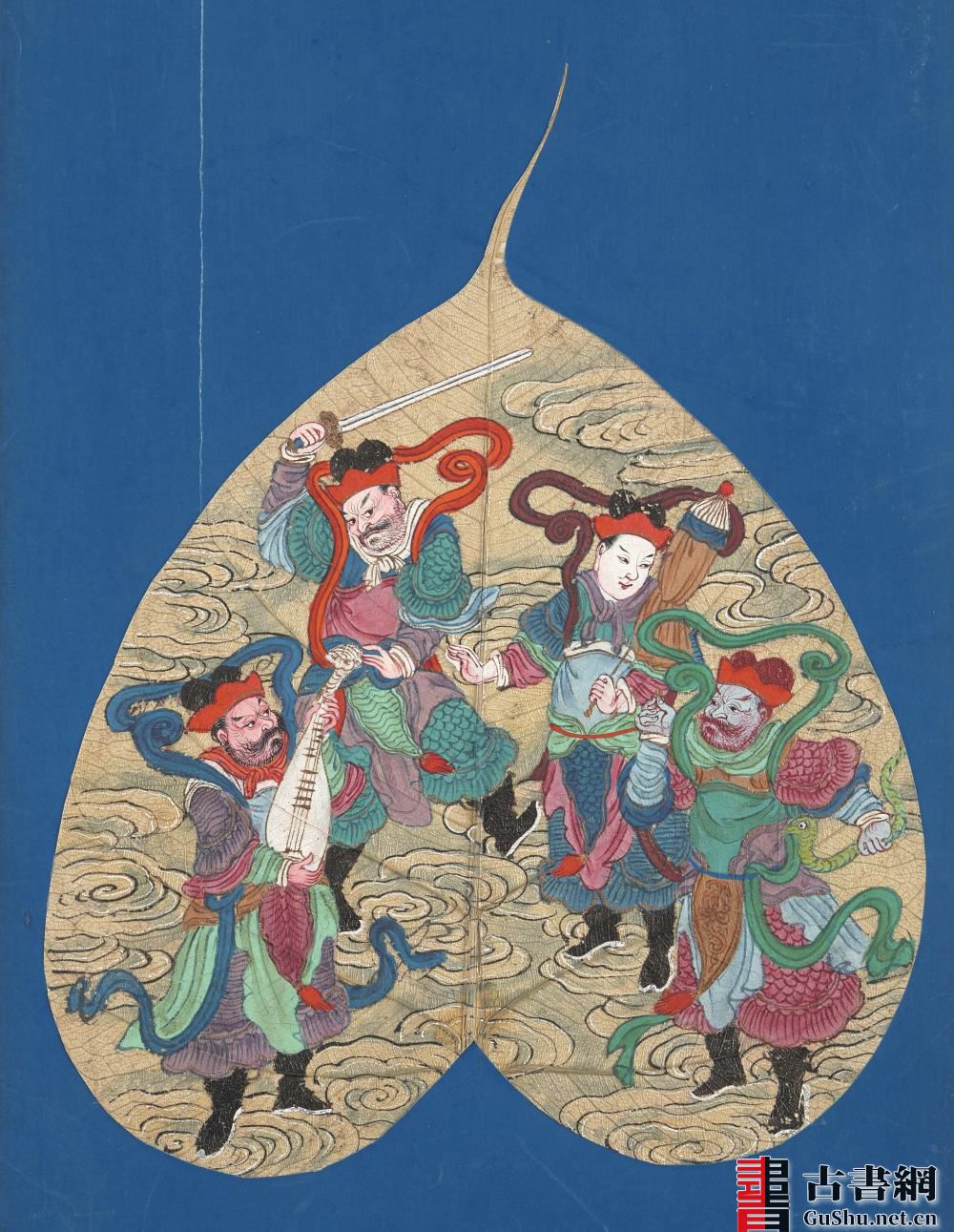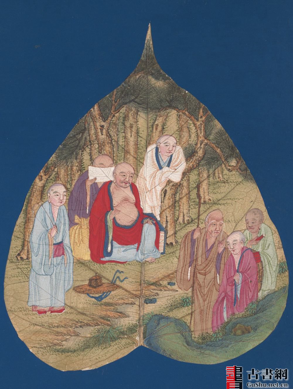 此套《菩提叶罗汉画》是以菩提树叶为素材媒介创作的画册。将菩提叶特殊处理后,再平铺在蓝色底纸上作画,多彩的画面和谐地与树叶的肌理自然美融为一体。此内含彩绘及墨绘本:彩绘佛像集、画罗汉写心经及金刚经本、画十八罗汉、画十六罗汉并书赞等共五种,约绘制于清代。
