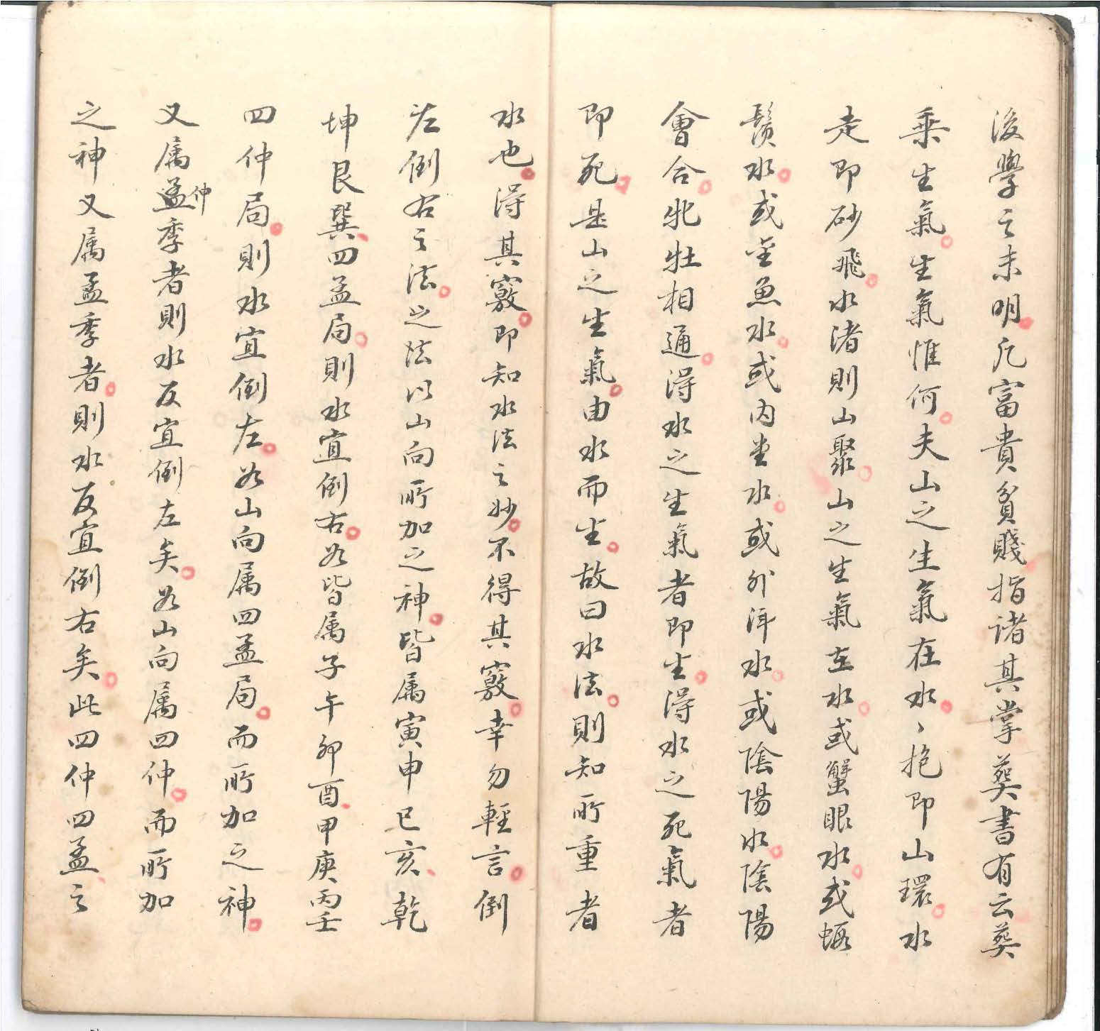 以上辩明水法之吉凶,其餘不合局者,未便轻举也,杨公之传,专用双山三合之法,而董公之书,亦然,近时坊家所刻地理,窃取古人名目,又复添以己见,因之鱼目不分,难可辩明,究其所以,无非希图捷径,聊以塞责,以歧不审是龙,加由向上用事,倒立生旺,穴无权衡,病死墓绝方水,有一归堂,冲破生旺,临值太岁,冲尅,未写不退财败绝之理,经云,有绝穴,无绝龙,有绝水,无绝向,必须先论真龙,然后扦得真穴,方可定向之水法吉凶,若论剪裁之地,立向亦要凭水法,合生旺,庻不貽矣,玉扵昔基用事,效尤迅速,得其法,为射中的,为车合辙,为券取物,无往不利也,尝见古今成败之地,坐山消纳者,富贵长远,向上用事者,败绝居多,信乎风水,要合双山三合之為法也,予家素召此书,后因遗失,近于残釜简中,捡得抄本,视之以為奇珍,同人观之,力劝曰,有此异获,私诸已者,孰若公之扵人,坊友中即有付就刊者,然恐好尚之偏也,因举近远发福之地,愿叙焉,以為一则,前事可师,而扦塟之误信者,或不失為恭视之一助云。——卢川,胡寿泉氏谨録,和川竹林氏抄藏