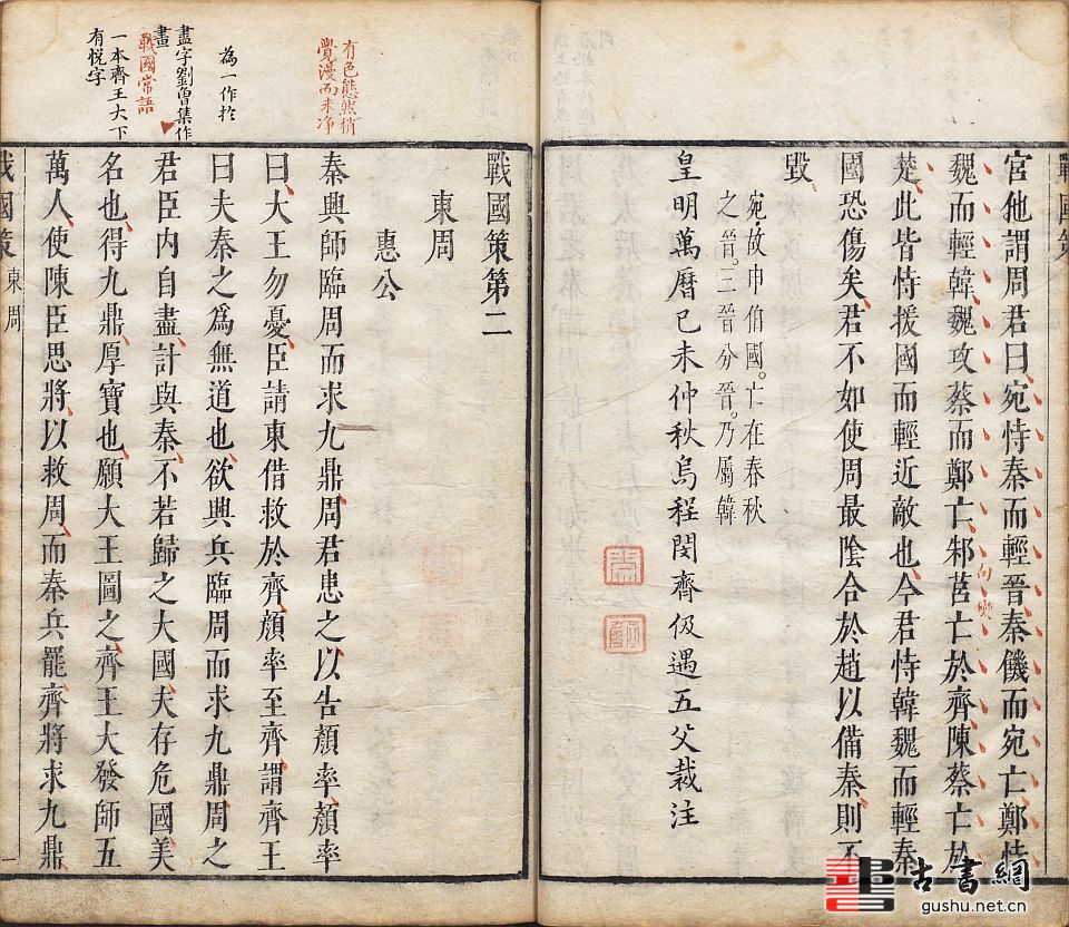 古籍.战国策.十二卷.附元本目录.明.闵齐伋裁注集评.明万历四十七年乌程闵氏三色套印本