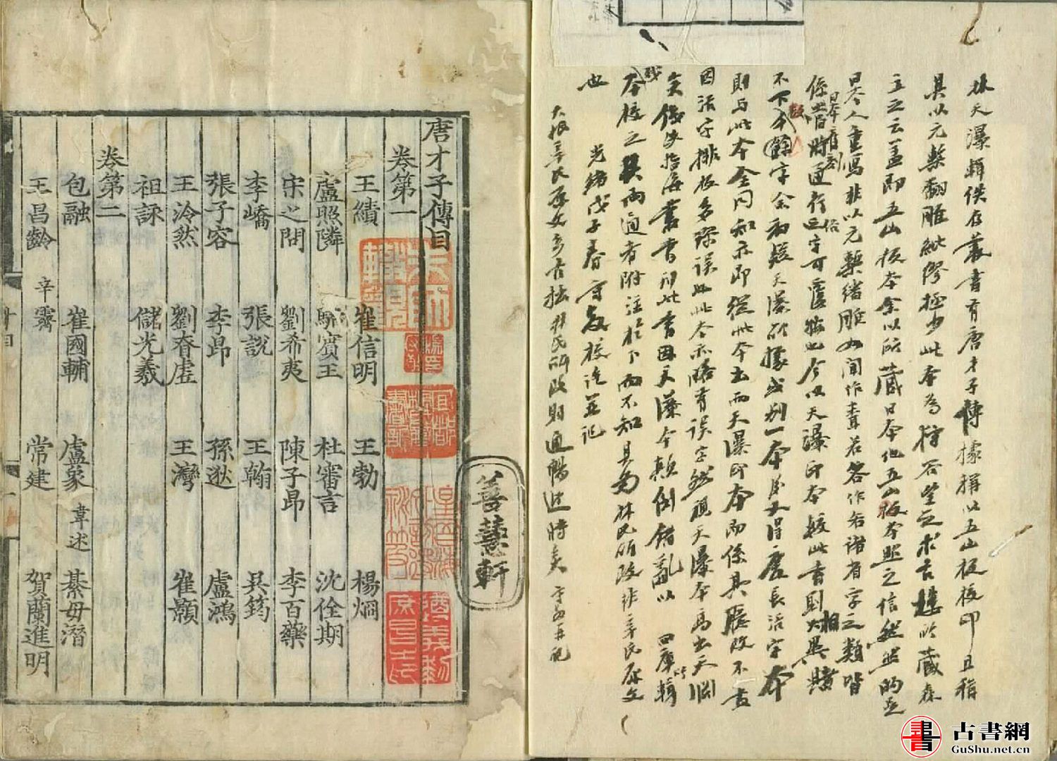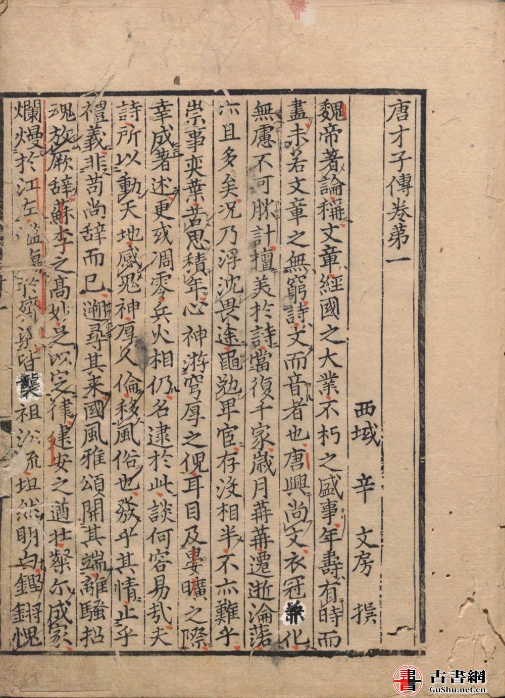 此《唐才子传》由元代西域人辛文房撰。全书共十卷,记载唐、五代诗人简要的评传二百七十八篇,传中又附一百二十人小传。书中保存了唐代诗人大量的生平资料﹐对其科举经历的记叙更为详备。清乾隆时期此书在中原已几乎亡佚。清光绪时期杨守敬从日本善慧轩访得五山本。此内含日本南北朝刊(五山版)两个藏本。