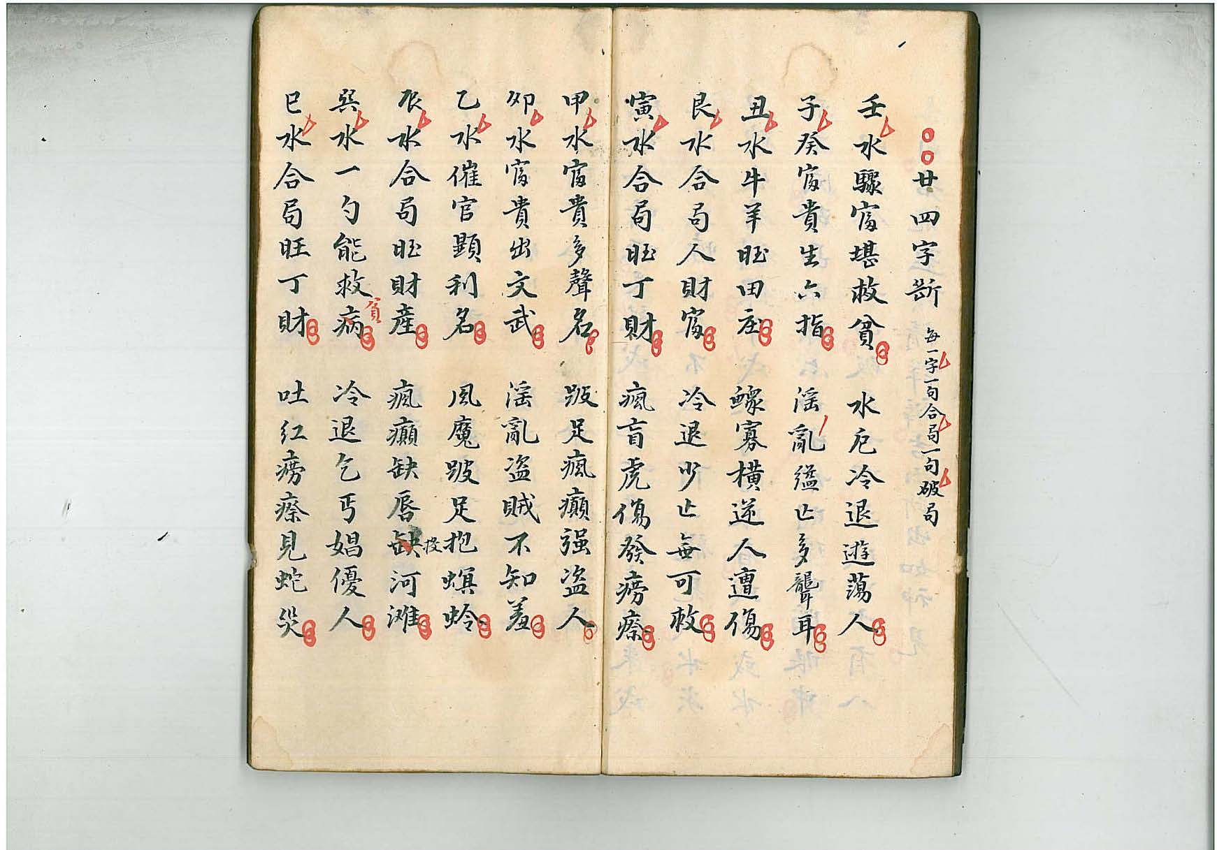 未坤鰥寡甚孤凄,吐血扛尸及僧尼,坤申双行鳏寡出,抛花山现淫无疑。庚申痨瘵祸非常,贼情人命不回乡,庚酉yin乱风声丑,破缺空陷子姓伤。辛戍绝嗣招继赘,驼跛残疾共相推,酉辛冷退為乞丐,窃恐女人惹是非。戍乾驼跛邋梨翁,刑妻克子鼓盆凶,乾亥双行人吐血,少亡孤寡见重重。壬亥虚痨损少年,初年发福后卖田,壬子双行小溺死,黄肿自缢莫怨天。癸丑双行骨肉伤,随母改嫁离家乡,少亡服药投河死,膨胀自缢祸非常。