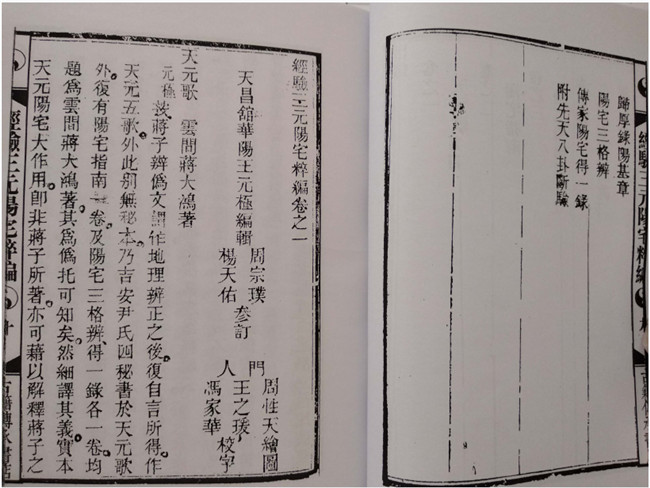 【三元阳宅粹编】收录的内容是【天元四歌】、【阳宅指南】,【归厚录】阳基章、【阳宅三格辨】、【阳宅得一录】(阳宅天天元赋)。