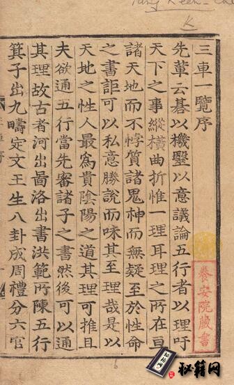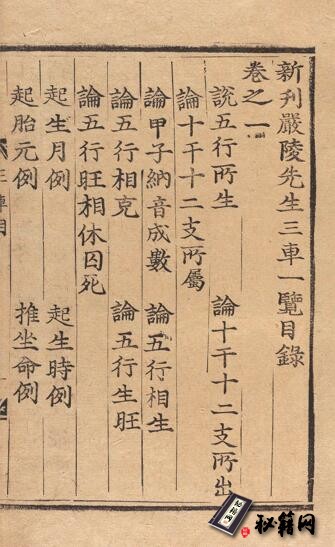 三车一览命书详论,书内又题《新刊严陵先生三车一览》、《严陵方氏三车一览》,序中又名《三车一览五行纪源》。【宋】方谦之编。十卷六十九章。线装三册。【南宋】景定二年辛酉(一二六一)序。疑朝鲜李朝翻刻本。