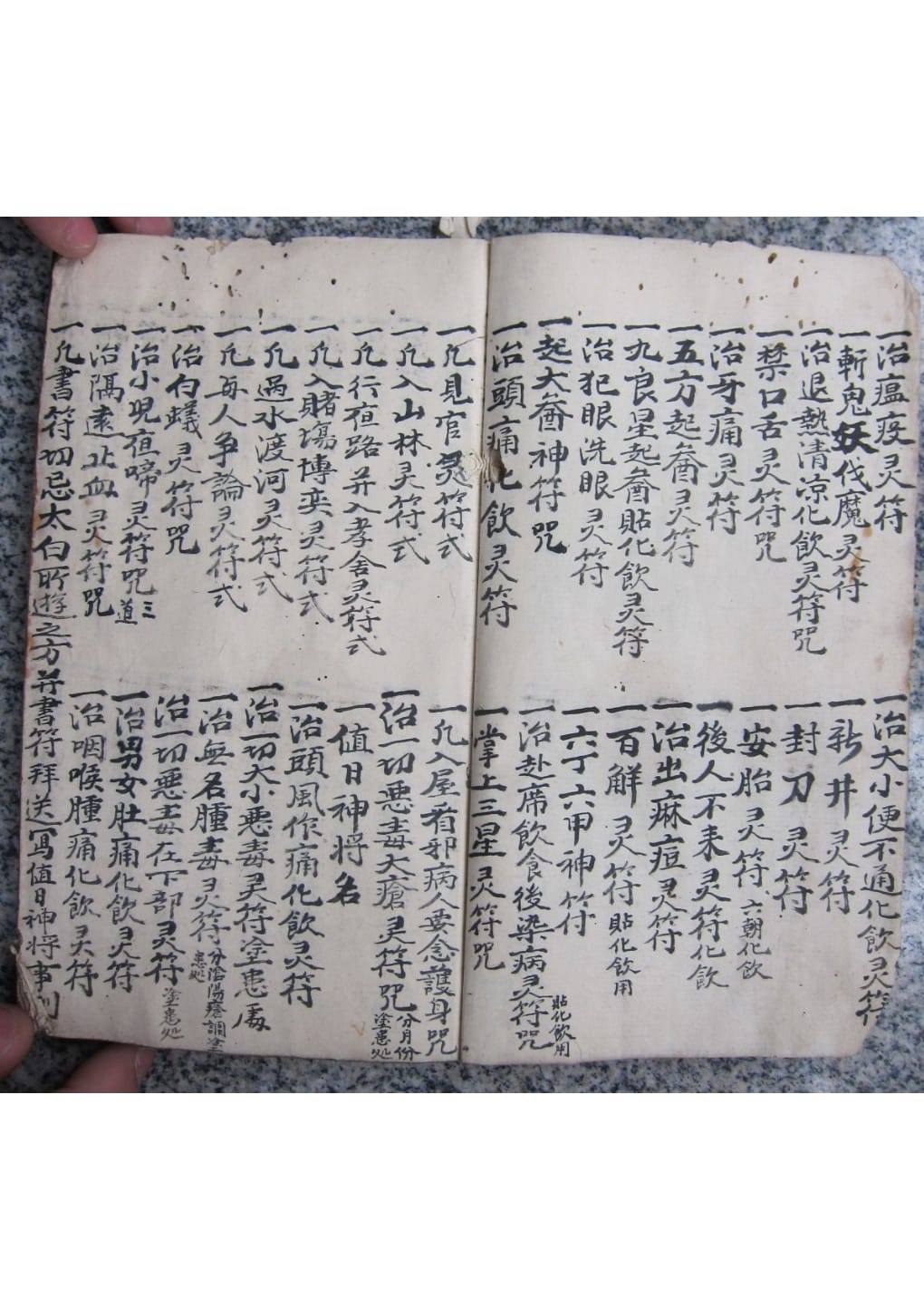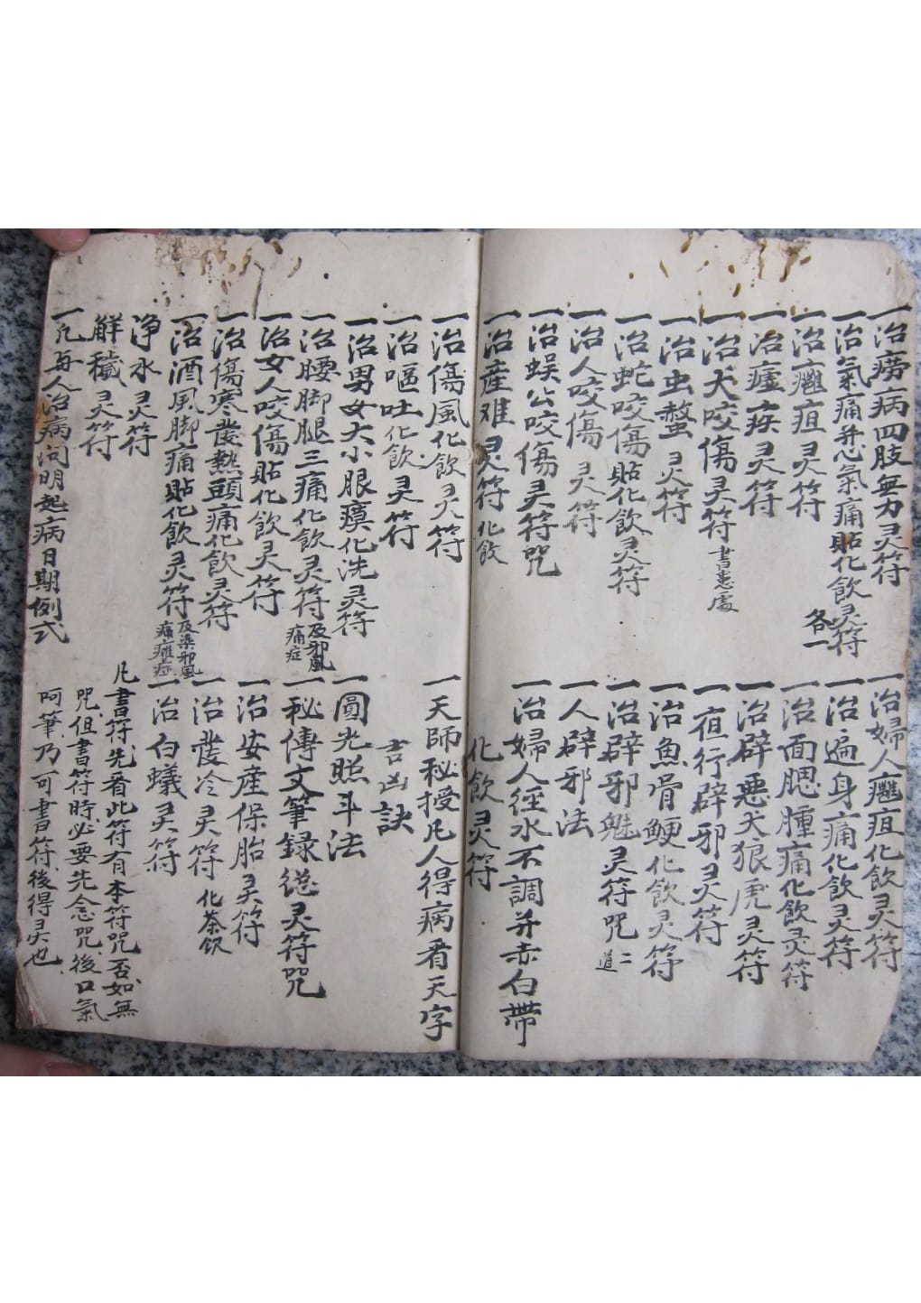 几遇百病,照依后列符式字法,或书符化灰,或调搽,或调服,或书符成章佩带,或贴,或书涂患处,各尽其法用之也。凡遇大小疮,宜办阴阳二症,如阴症,用羌汁磨墨,阳症,用好醋磨墨,照法书涂疮上,宜露出疮口为妙,待至墨于,用猪胆汁涂之,其效更速,但书符之法,不拘佩化及书于疮上,宜写治病之字,书入雷字内,更须先写勅,次写令,次写。。。