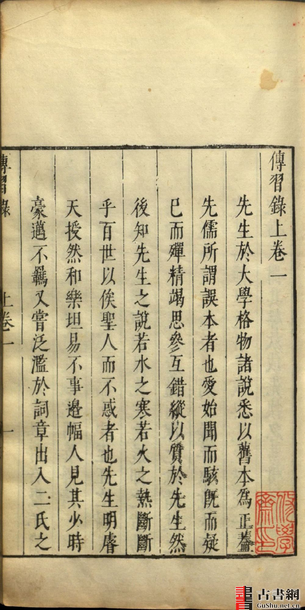 此美国国会图书馆藏本为明明嘉靖二十九年王畿重刻本。全书共分八卷,上卷分为三卷,三卷依次为徐爱、陆澄、薛侃所录,并于各人所录语录后标识 “右门人徐爱日仁录”“右门人陆澄录”“右门人薛侃录”。徐爱录后有薛侃识语:“日仁所纪凡三卷,侃近得此数条并两小序,其余俟求其家附录之。正德戊寅春薛侃识。” 。下卷分为五卷,卷一首收《答徐成之书》两通,中间唯以 “又” 字分隔,书后附南逢吉识语。次收《答罗整庵少宰书》一通。卷二唯收《答人论学书》一通。卷三收《答周道通书》一通,《答陆原静书》二通,中间亦以 “又” 分隔。卷四收《答欧阳崇一》书一通,《答聂文蔚书》一通。卷五所收非书信,乃《示弟立志说》《训蒙大意示教读刘伯颂等》(包括所附《教约》。