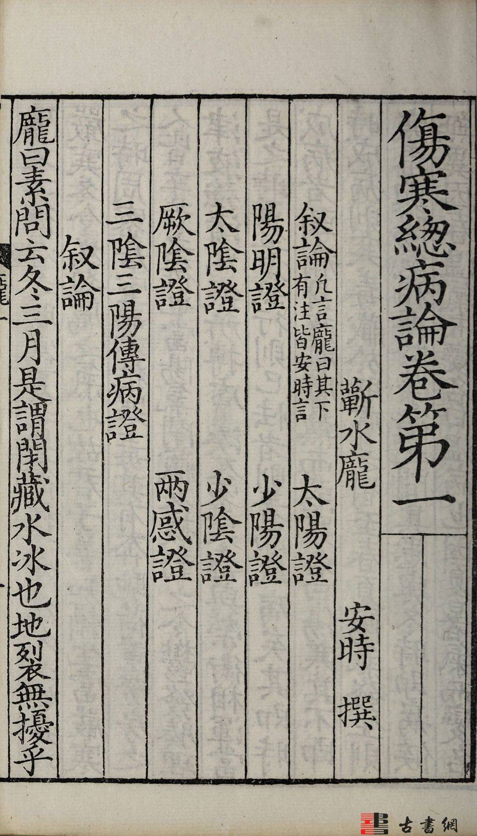 卷第一、叙论、太阳证、阳明证、少阳证、太阴证、少阴证、厥阴证、两感证、三阴三阳传病证
