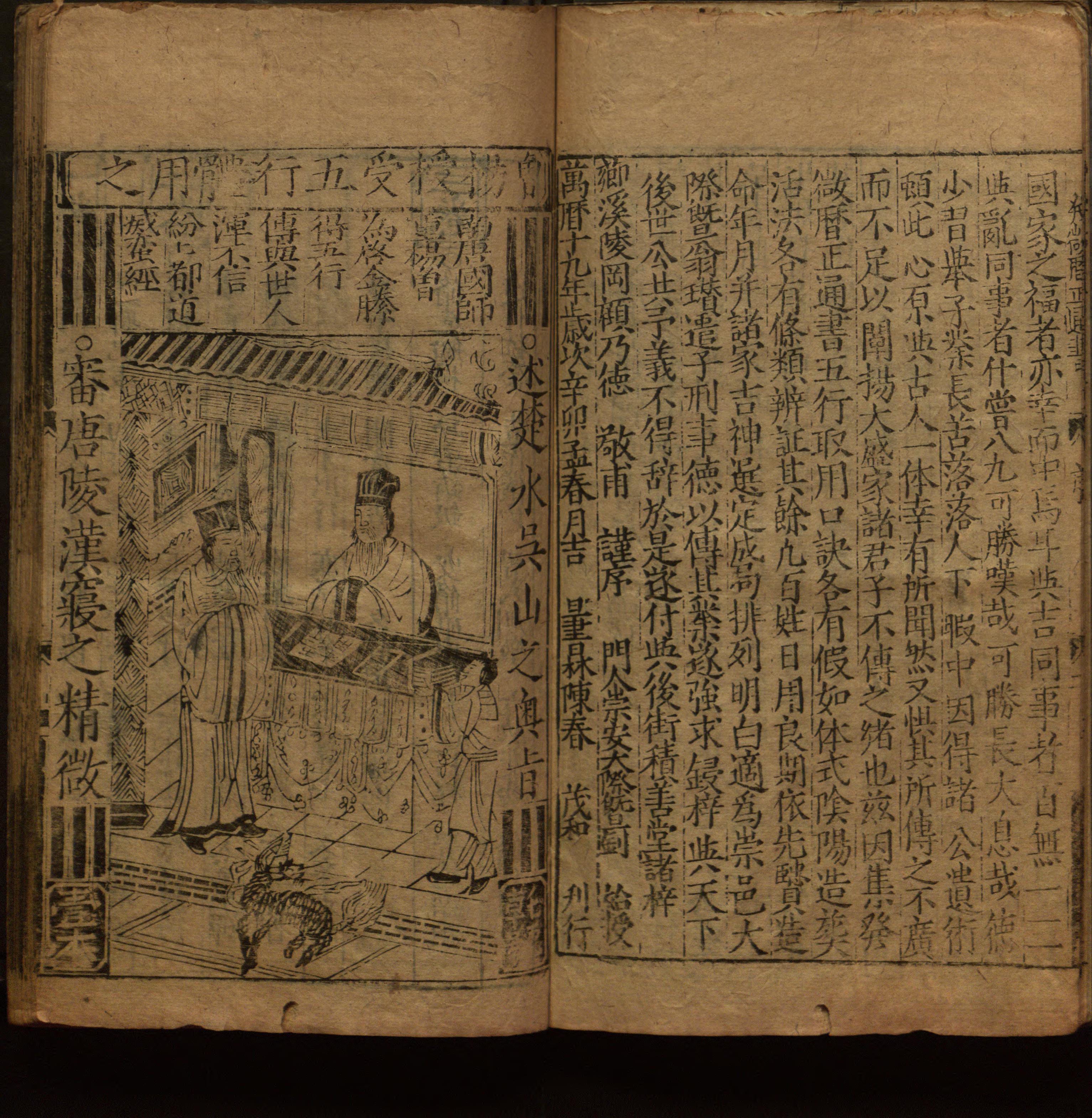 正文卷端题"新刊重考全补发微历正通书大全卷之一",下署"临江宋曾珍辉山通书,金谿何士泰景祥历法,鰲峰熊宗立道轩纂,乐平吴斋洪理天典历府,章贡云隐池纪本理重类,薌溪陵冈顾乃德敬甫历正"。正文前有嘉靖三十一年夏浚"叙发微历正通书大全",顾乃德"全补发微历正通书序","会杨授受五行体用之"图,卷一至三目录。以下每册前有目录,除第七册外每册前有图一幅,刻印较粗。末叶有莲花座木记六行,题曰:"通书一书,名色杂出。五行倒论,祕传悉/演。兹因受陵冈全补历正通书一部,命/工鋟梓,荣惠天下,以便选览。凡我四方/君子,务要认取书林后街积善堂茂和/续刊增补图局。明白标题,方為的实者。/万历壬辰年(二十年,1592)孟春月吉旦日,陈氏刊行"。据卷前顾乃德序末行题:"万历十九年岁次辛卯孟春吉日,书林陈春茂和刊行",是陈氏名春,字茂和。通书為民间历法阴阳五行万寳全书,此书实為顾乃德据旧本增补。