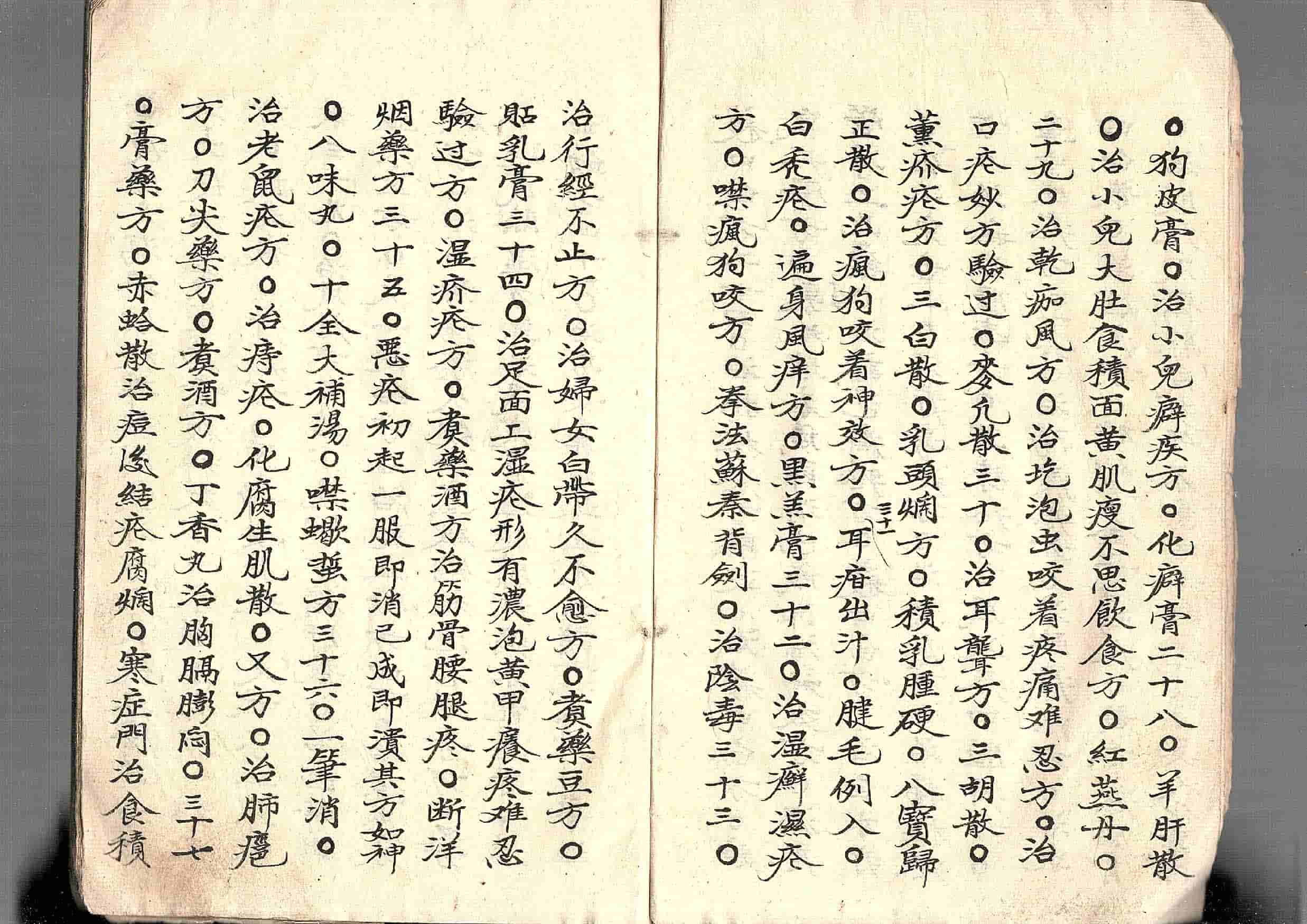 内容包括:牙痛方、化毒丹、八宝散、红膏药方、治牙疳方、牙疳服药又方、三品定子、四金定子、透骨散、四白散、代针散、生肌散、珍珠散、人马平安散、黄连生肌散、八宝生肌散、针头散、玉红散、铁桶膏、桃红散、地疔散、巴豆膏、九龙针、黄连膏药、清凉生肌散、刀尖膏药方、面生疮疱、枯痔散、红燕丹、湿疥疮方、八味丸、十全大补汤、治妇人三十二杂症等。