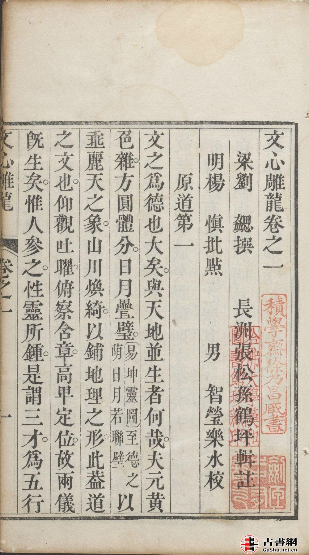 卷首题:梁 劉勰 撰、長洲張松孫鶴坪輯注、明 楊慎 批點、男 智螢樂水校